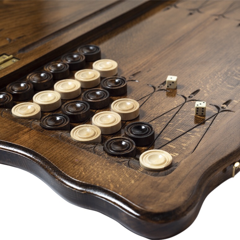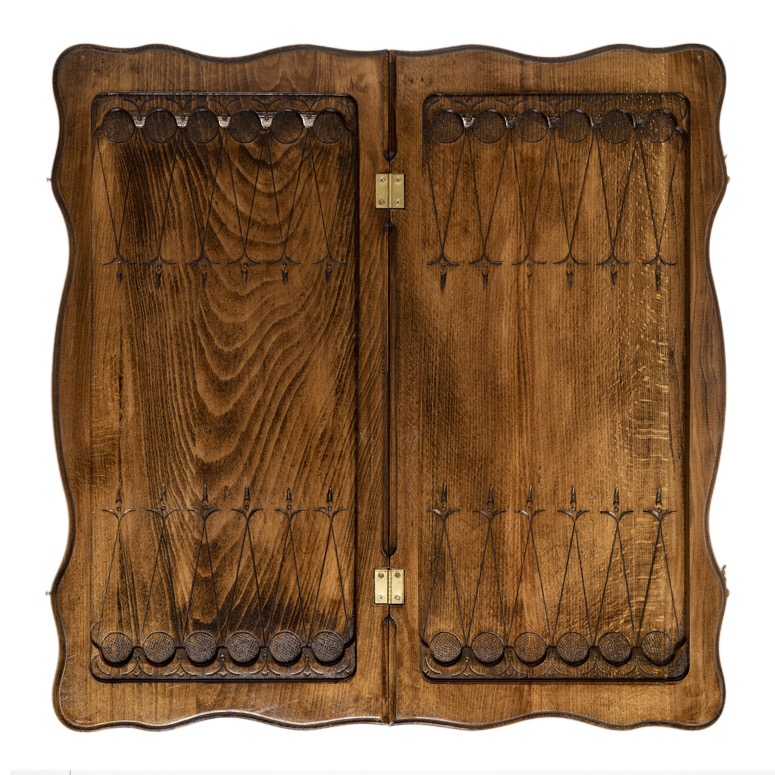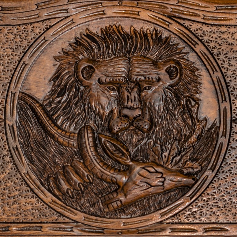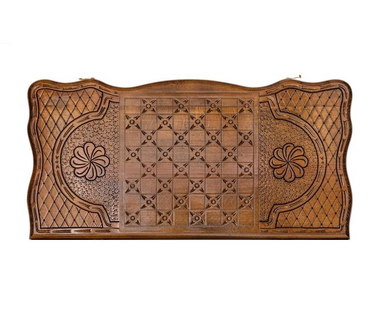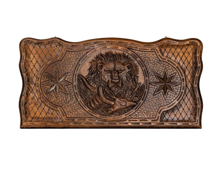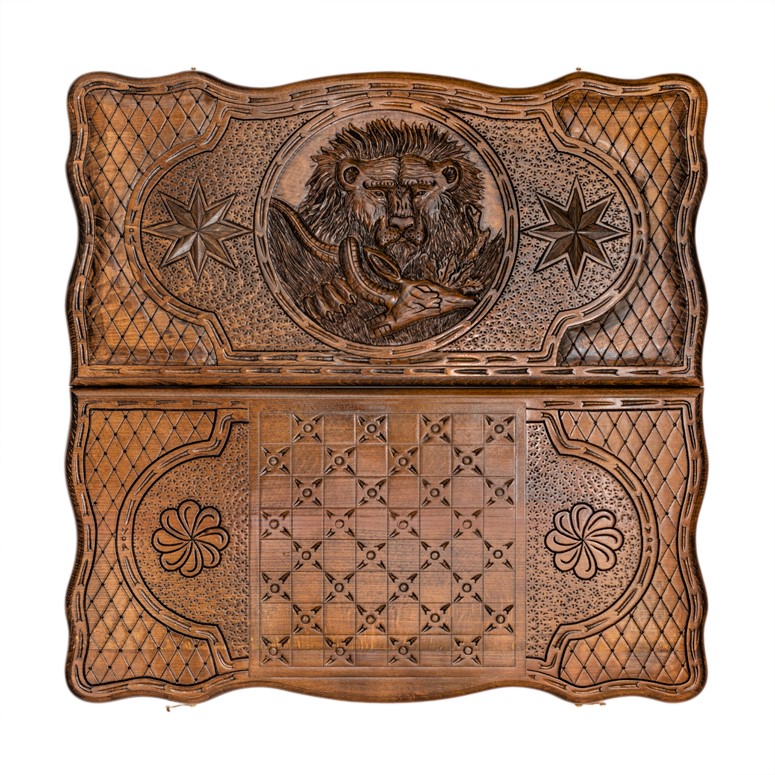 Нарды резные "Лев с добычей", сделанные из древесины бука собственными руками мастера Артура Мирзояна, чье имя стало известно далеко за пределами Армении, благодаря отличному качеству. Он уделяет внимание каждой детали, даже которых не видно на первый взгляд. Древесина бука обладает отличным показателем прочности, поэтому можно будет не сильно беспокоиться о возможности поломки изделия. Бук очень хорошо сопротивляется механическим повреждениям, вроде ударов и падений, и не позволяет появиться трещинам. Части доски, украшенной изысканными узорами, скреплены между собой фурнитурой из латуни. Петли и крючки выливаются в специальных формах. Сама же доска покрыта защитным лаком, предотвращающим появление царапин. На каждой фишке прикреплена бархатная подложка, что также предотвращает появление царапин в процессе игры.