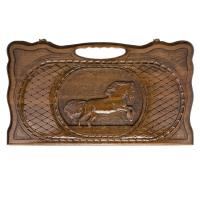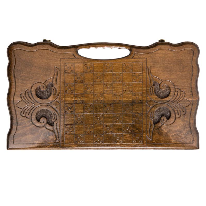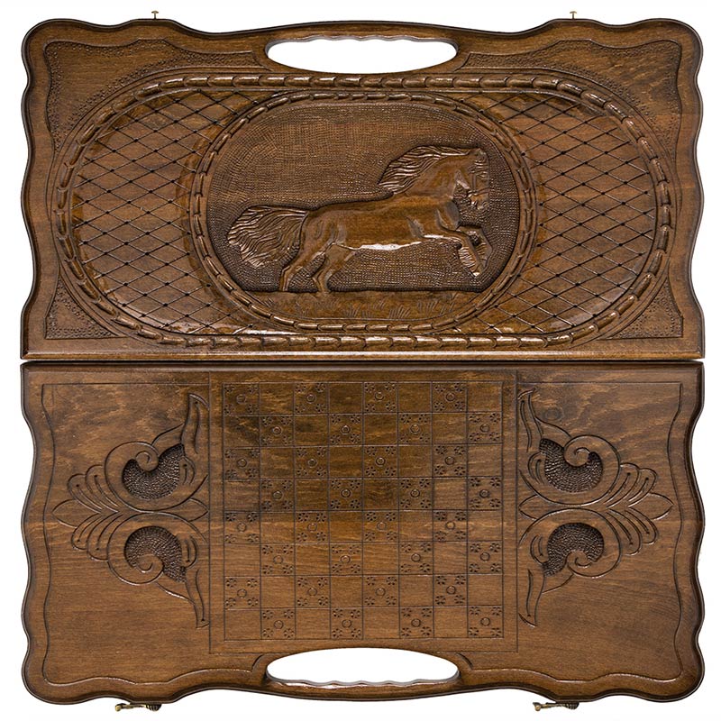 Одна из створок украшена изображением лошади, готовой пустить в бег. Резьба здесь выполнена с максимальной детализацией, чего не каждый профессиональный художник сможет достигнуть. На второй створке нанесено поле для игры в шашки, что удобно, когда нет времени на партию в нарды. Обратите внимание на ручку, которая является частью доски, а не просто прикреплена к ней. С ее помощью вы легко сможете переносить нарды, отправляясь к друзьям или родственникам и найти там себе партнера для игры.