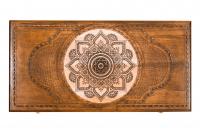 На внешней стороне передней створки вырезан символьный узор, окружённый мелким орнаментом. Разнообразная резьба присутствует и на внутренних частях - в центре, около каждой ячейки для фишек, и даже на петлях. Последние, как и крючки, сделаны из мягкой бронзы, которая практически не может сломаться во время использования. На комплектных фишках предусмотрена мягкая подложка, что не позволит поцарапать красивое изделие.