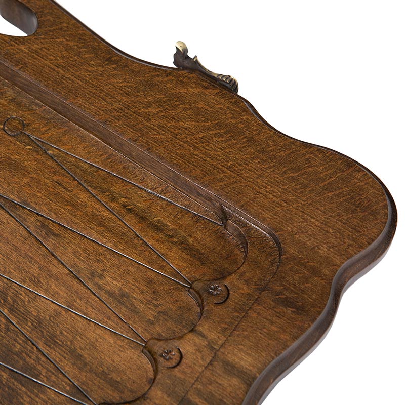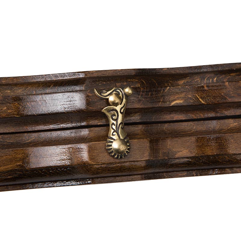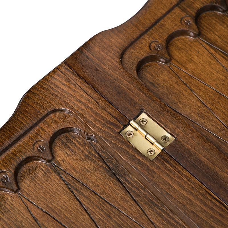 На внешней стороне, опять же вручную, вырезаны специфичные узоры, окаймляющие круг, внутри которого красуется медведь. Мастер уделил внимание деталям и на теле зверя видно каждый волосок. В этих нардах все находится в гармонии – сама доска, петли, крючки, фишки и игральные камни. Это говорит о том, что в это изделие вложена душа человека, который своими руками держал инструмент и вырезал малейшие детали.Не доска