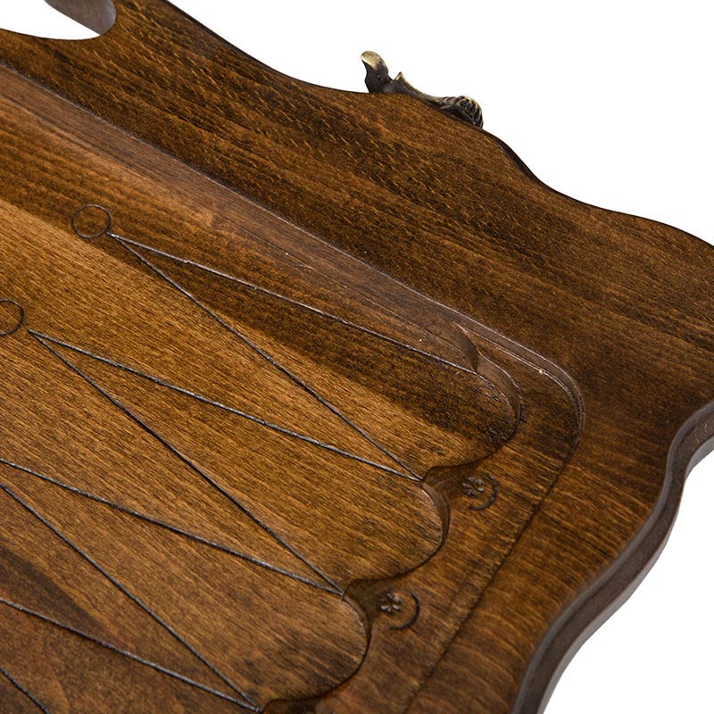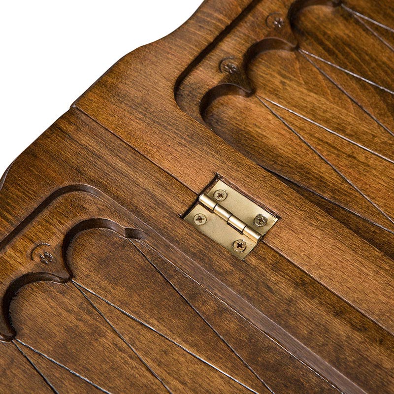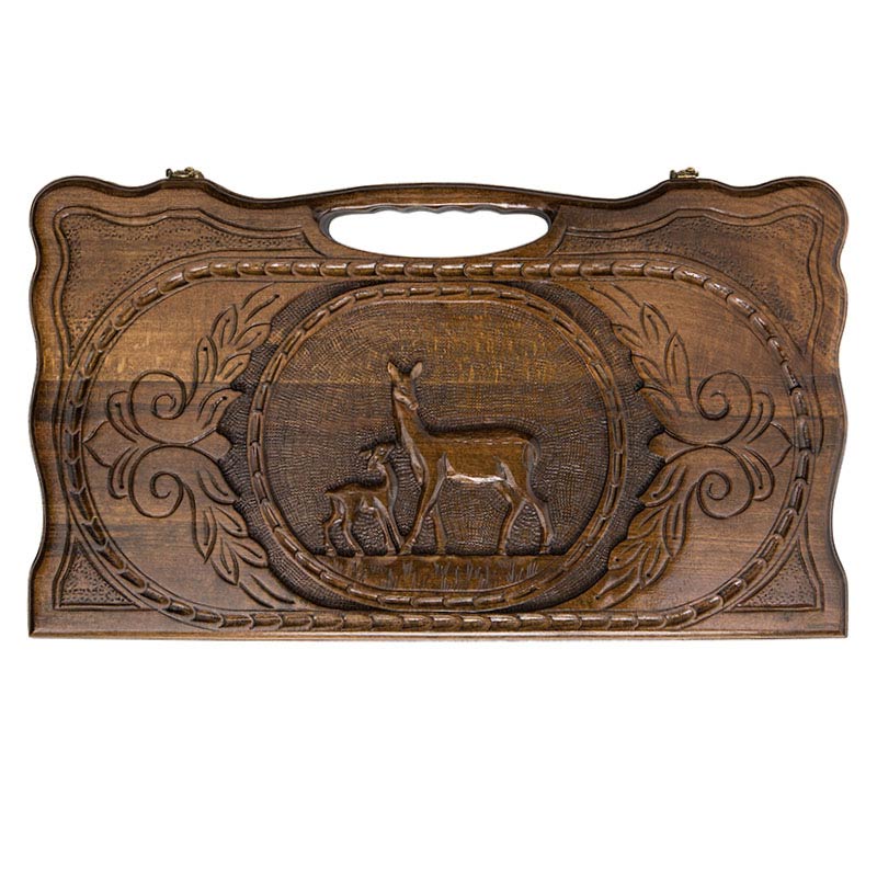Карен Халеян известен тем, что он украшает свои детища различными резными композициями. В этом случае была выбрана картина, где самка оленя гордо стоит рядом со своим малышом. Все это дополнительно украшено резкой, придающих целостности. На второй створке разлиновано поле, позволяющее играть в обычные шашки. Крючки из бронзы тоже не простые – прямо на металл нанесен узор, что придает им уникальности. Кстати петли также бронзовые и точно прослужат долго, независимо от того, насколько часто вы будете открывать и закрывать доску.Характеристики