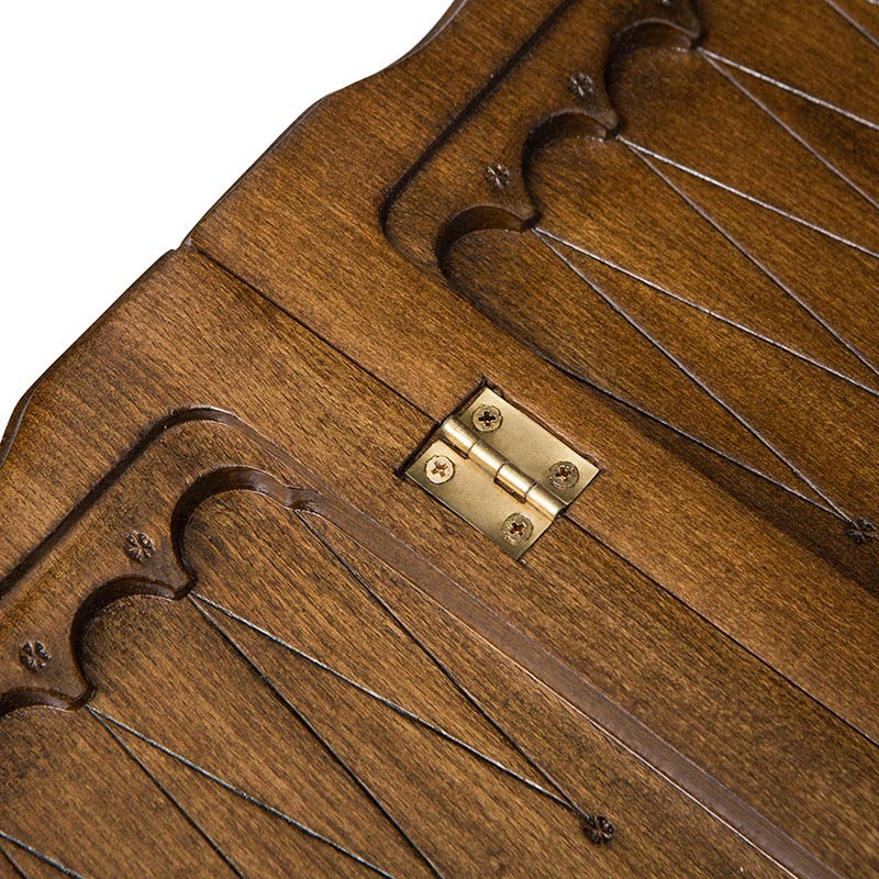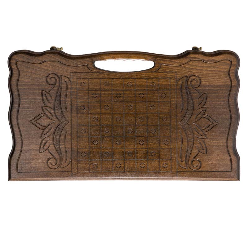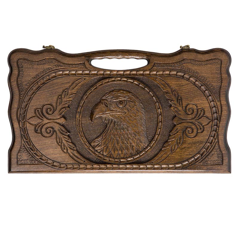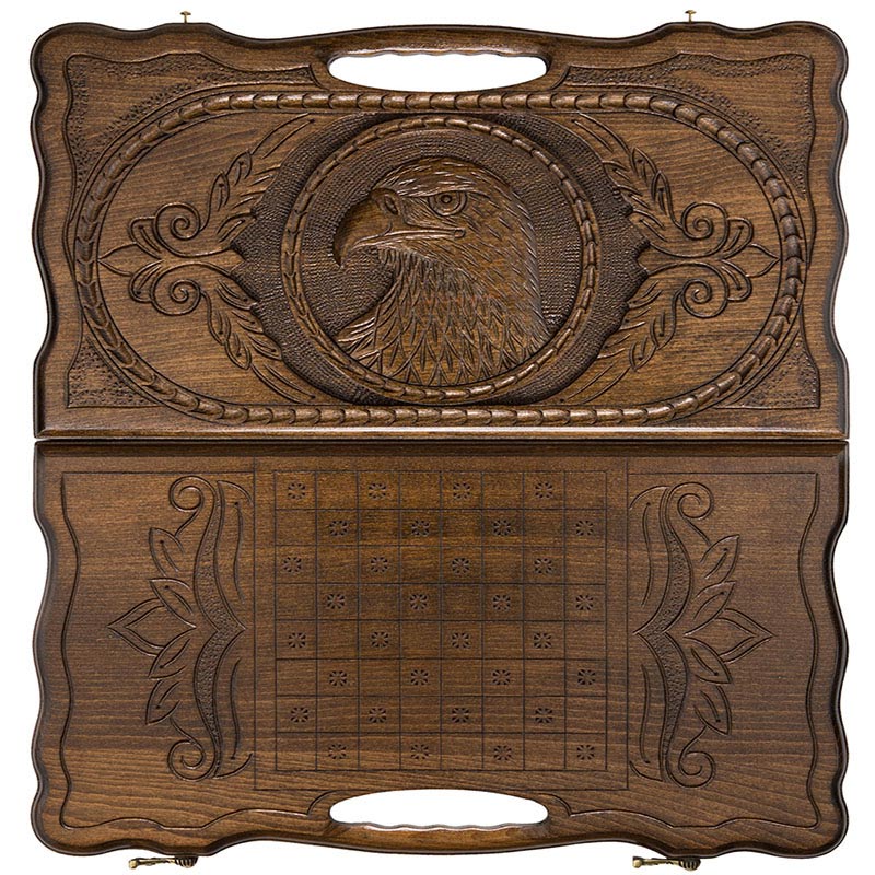 С обратной стороны доски, вырезана голова орла, причем в настолько мельчайших подробностях, что кажется, будто он сейчас оживет. Повсюду нанесены интересные восточные узоры, что придает еще больше «богатства» нардам резным Орел от известного мастера. Также здесь есть поле для игры в шашки, чтобы вы могли отвлечься от нард.
