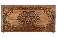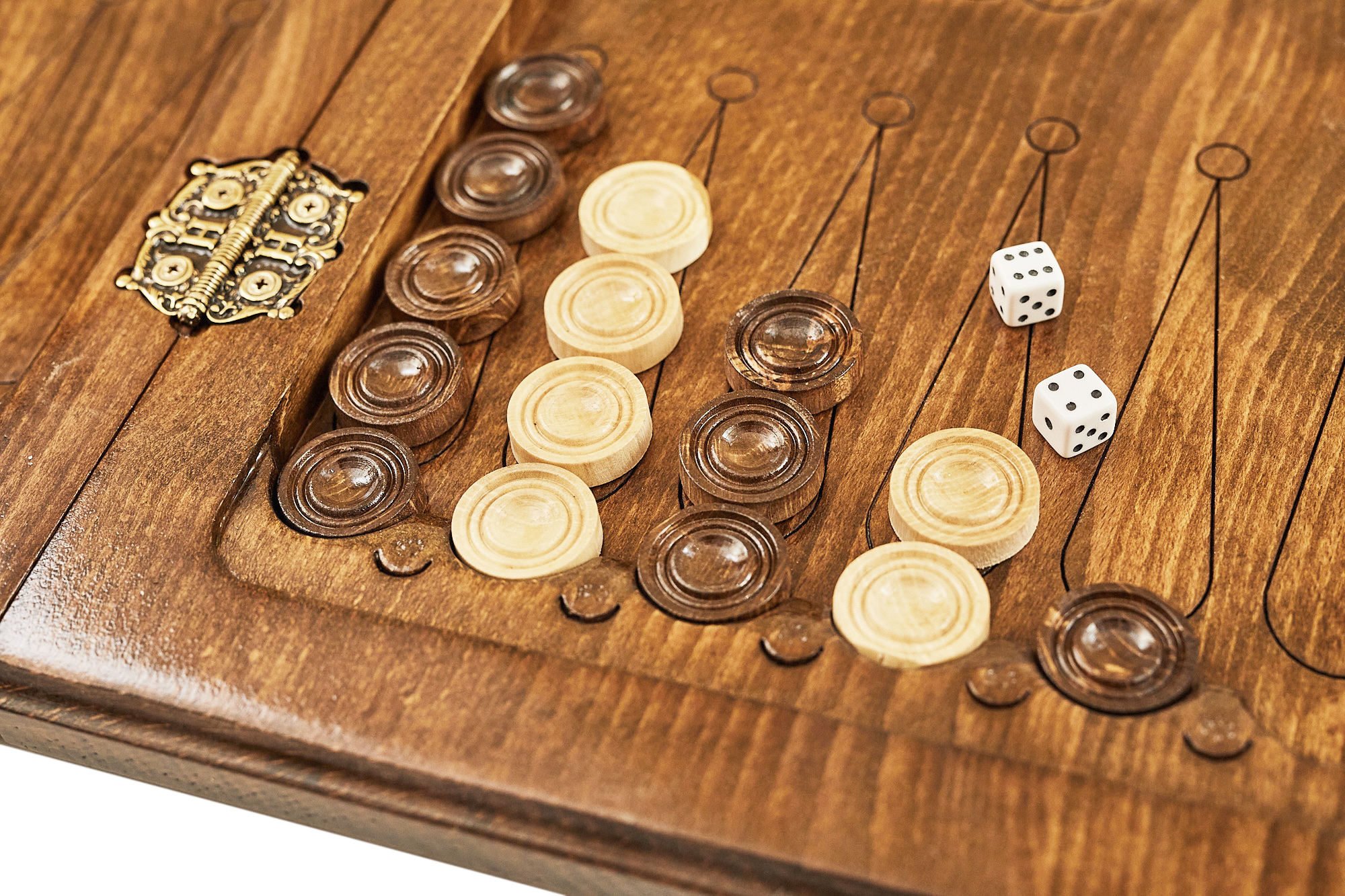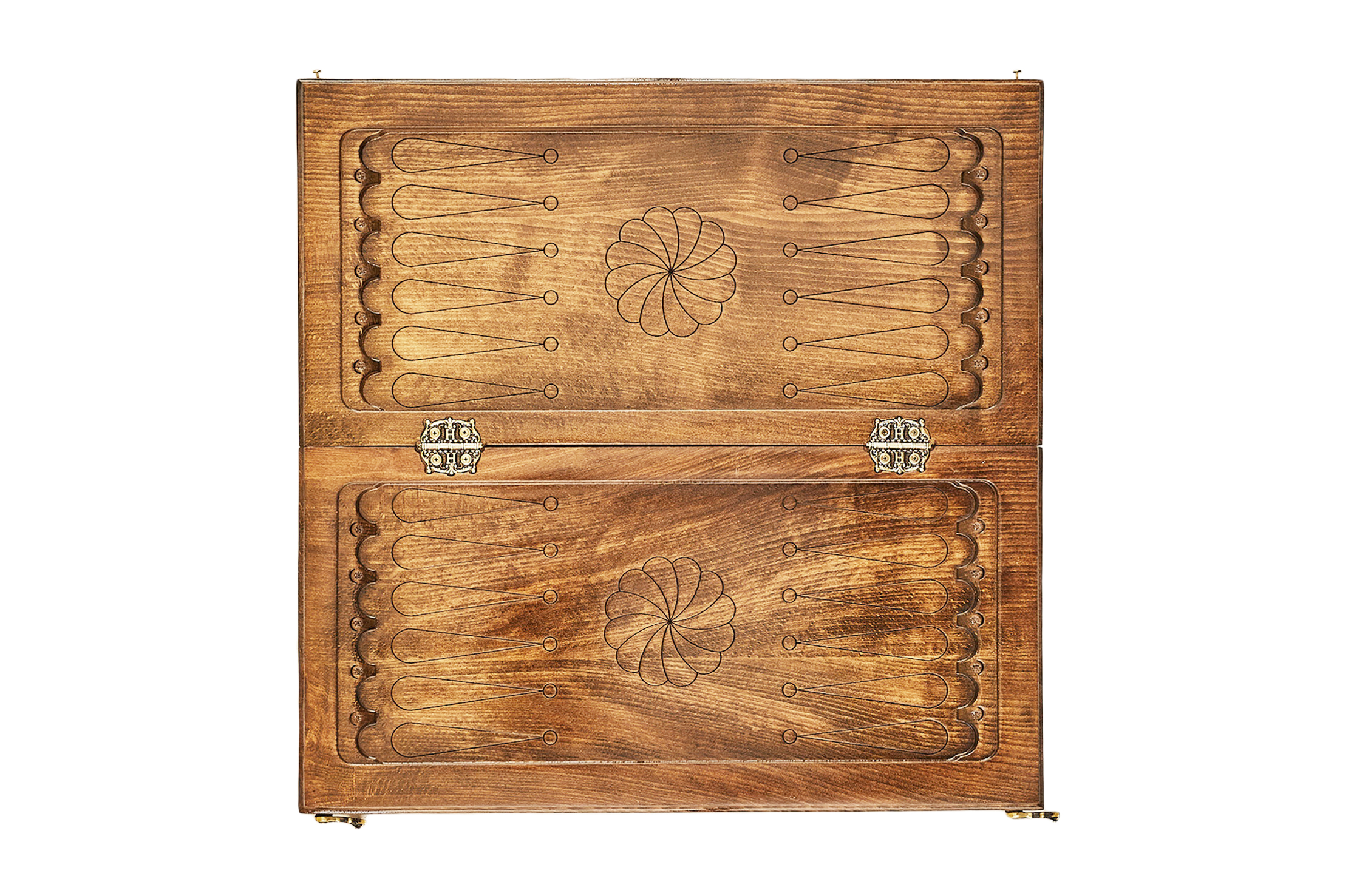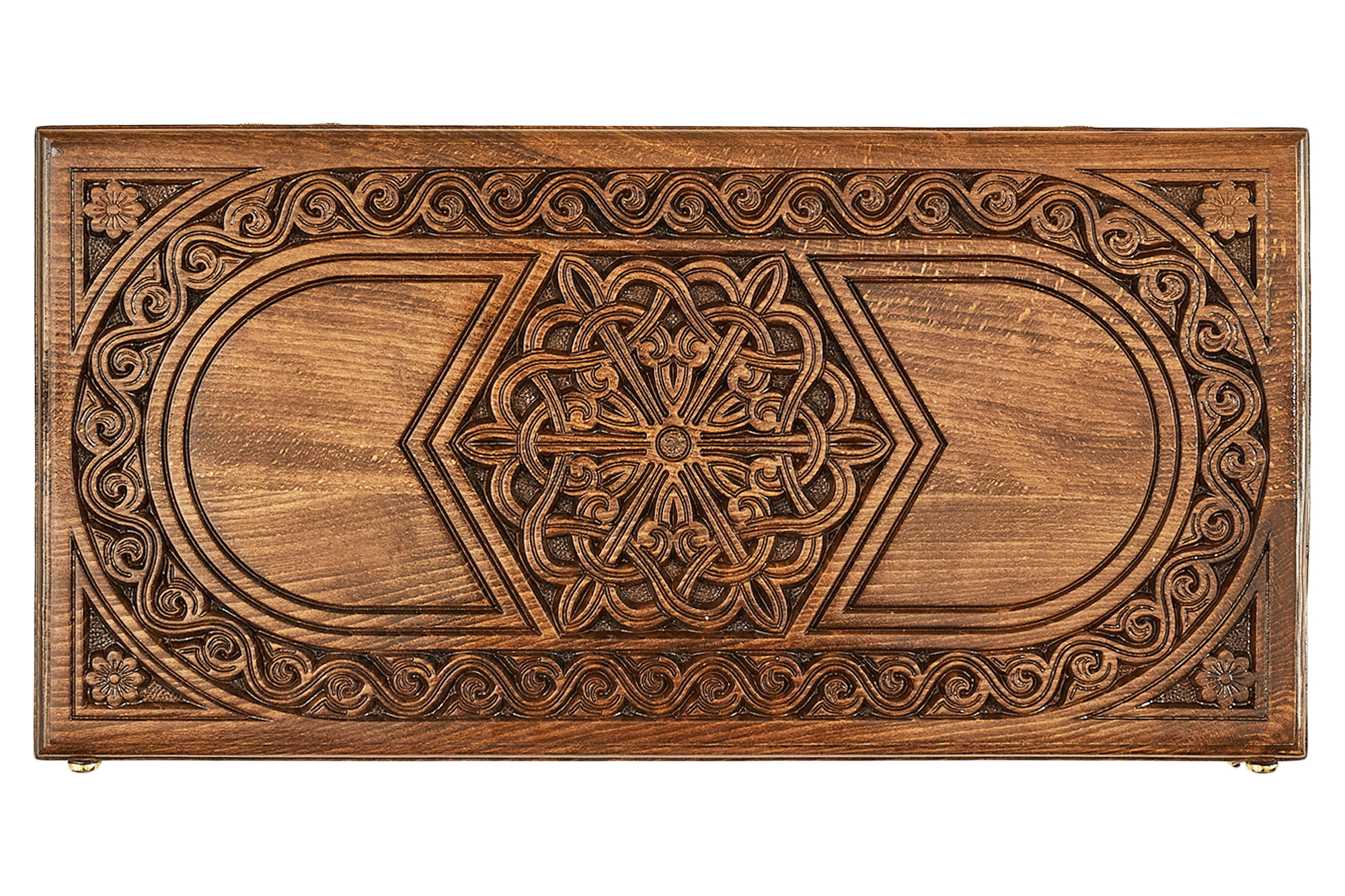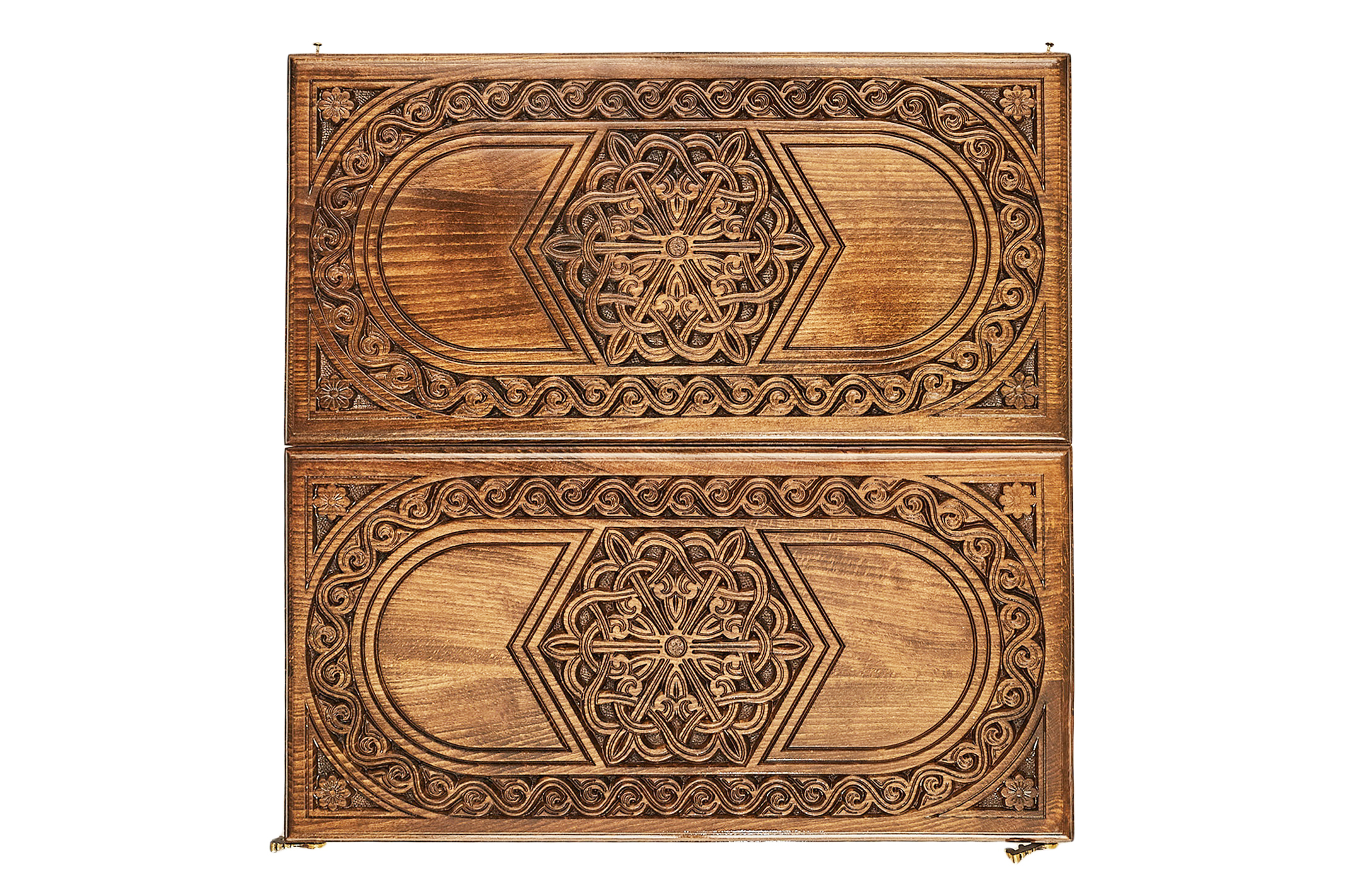 Резные нарды «Шестигранный узор» - эксклюзивная ручная работа известного армянского мастера. Подарочный набор из двух традиционных настольных игр - нард и шашек, поле для которых расположено на оборотной внешней стороне. Доска, сделанная из натурального массива бука, скреплена надежными и износостойкими бронзовыми петлями, поэтому о ее долговечности можно не беспокоиться. Кроме того, каждая из фишек в комплекте имеет подложку, призванную защищать доску от царапания во время игры. Также в комплект входит пара костей.
