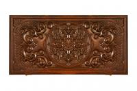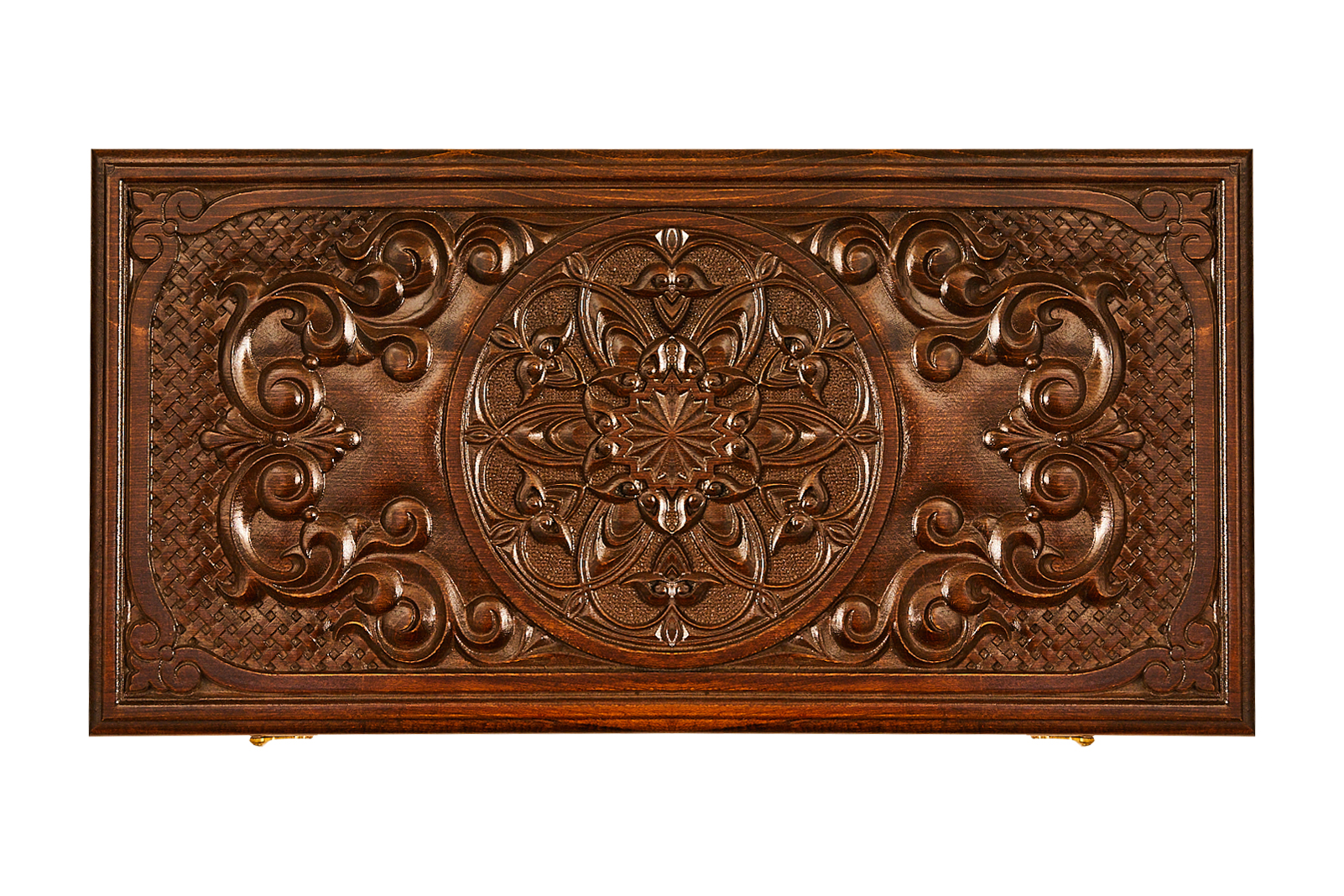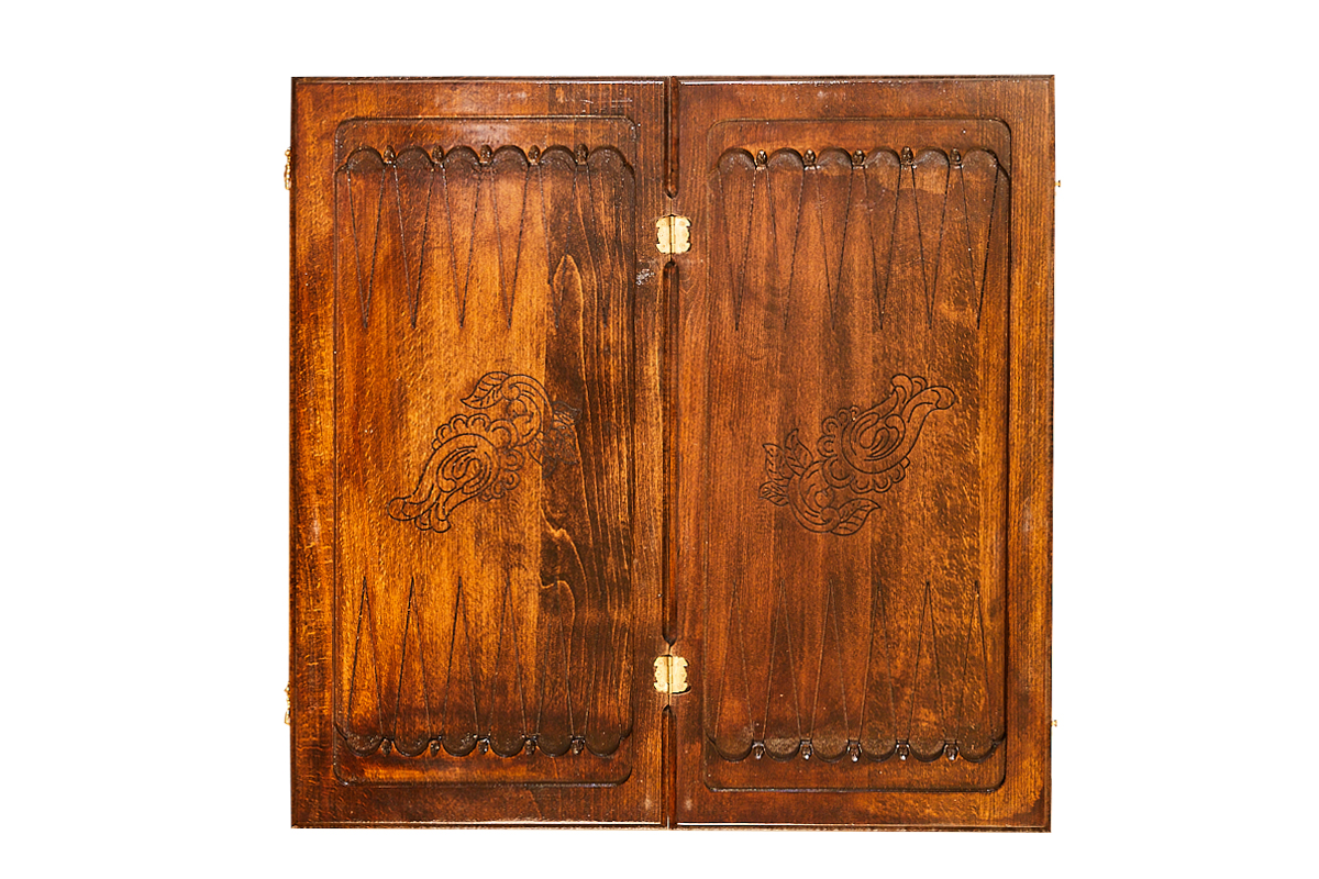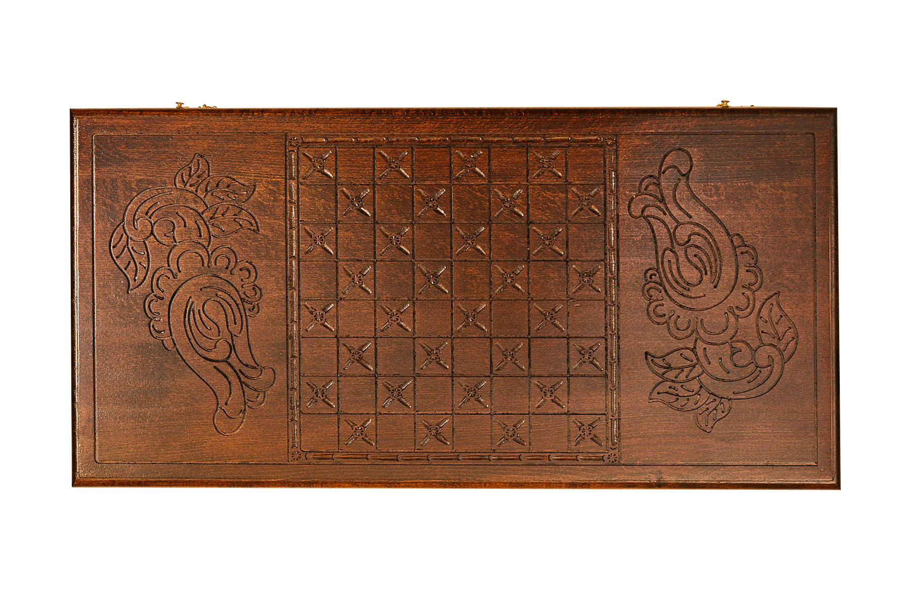 Чтобы придать нардам уникальный внешний вид, на лицевую поверхность была нанесена целая композиция из различных узоров, которые сразу выделяют её среди всех изделий. Задняя сторона более скромная - тут имеется резьба, а также специальное поле, где можно играть в шашки. В комплекте с изделием идёт удобный тканевый чехол, который будет надёжно защищать во время транспортировки.
