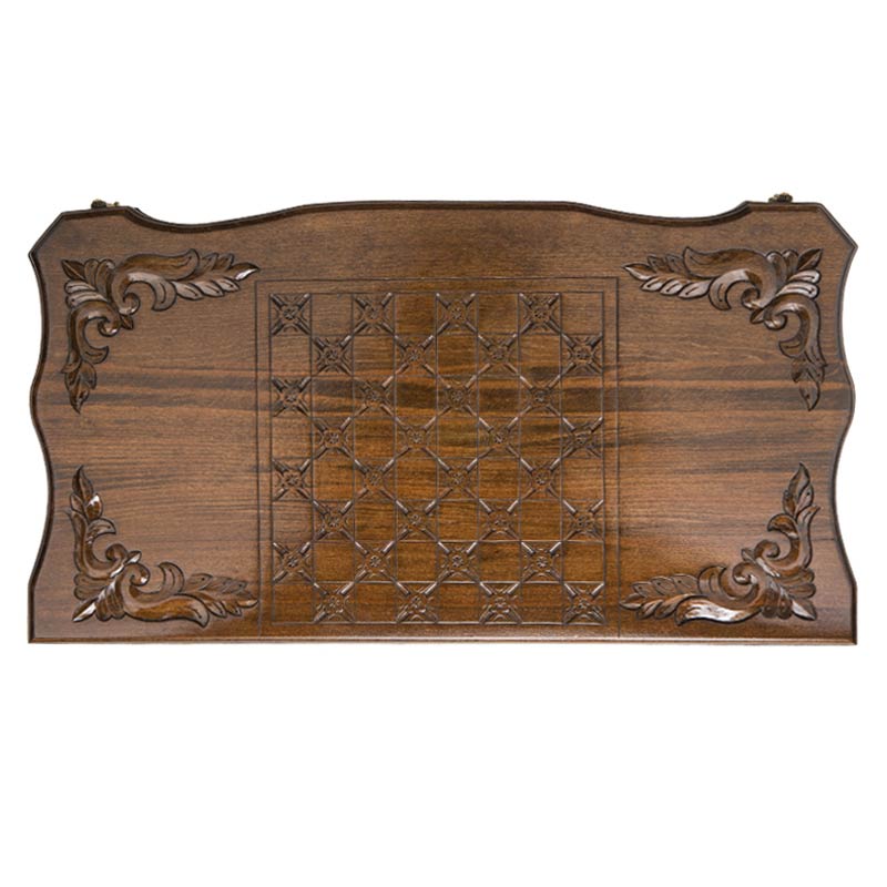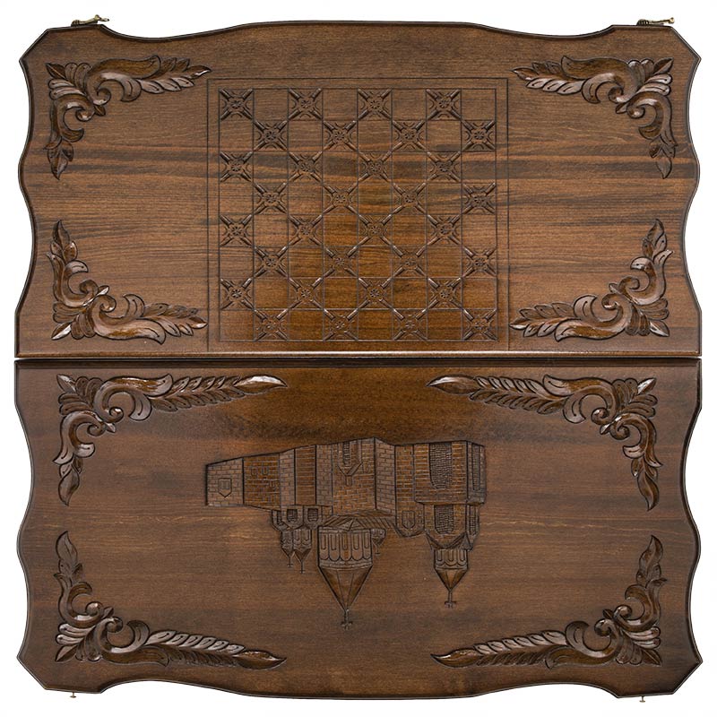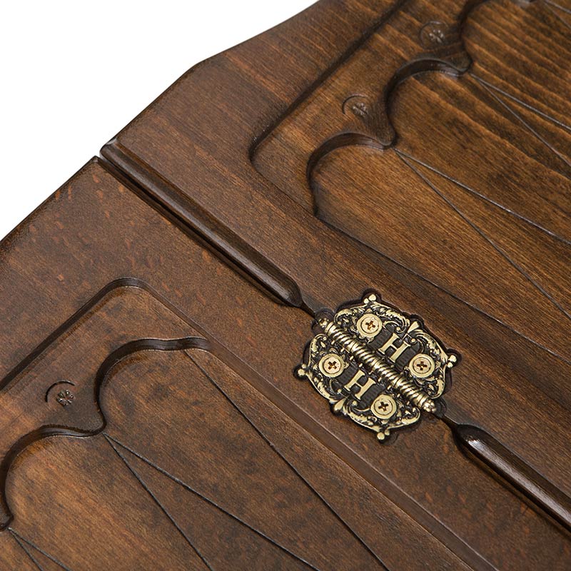 На внутренней стороне вырезаны ячейки, как раз по размеру фишек, а в середине также имеется символичный рисунок. Внимание мастер уделил даже петлям, которые тут выполнены из бронзы, с гравировкой буквы H, которая является эмблемой изготовителя. Бронзовые также и крючки, опять же с узорчатым оформлением. На краях доски предусмотрены небольшие углубления, куда можно помещать фишки, вышедшие из игры и зарики.