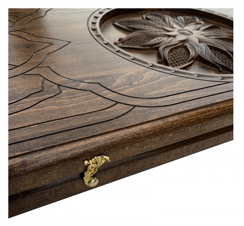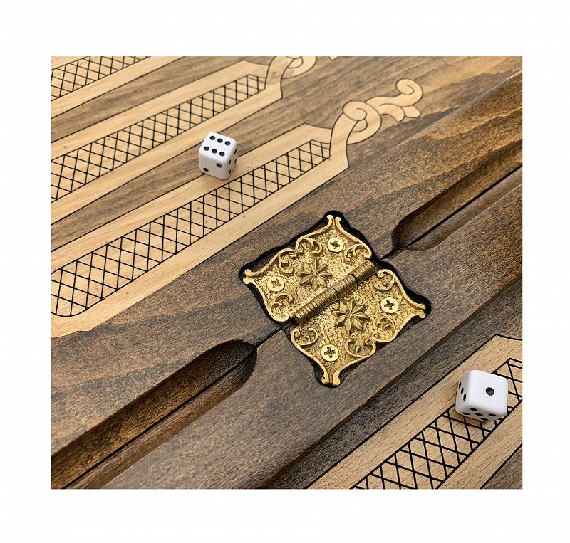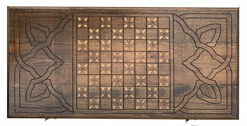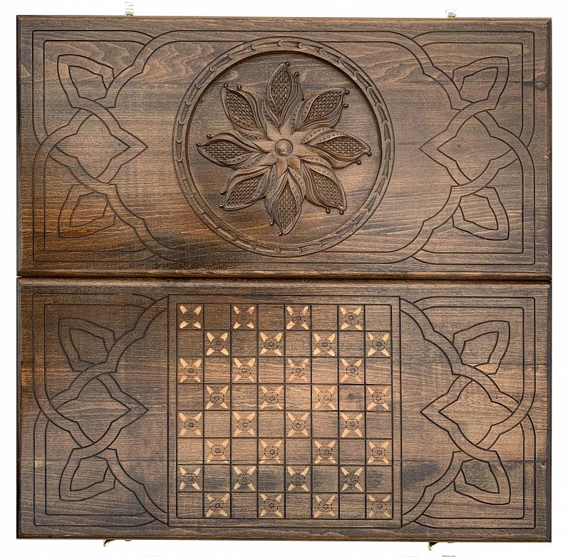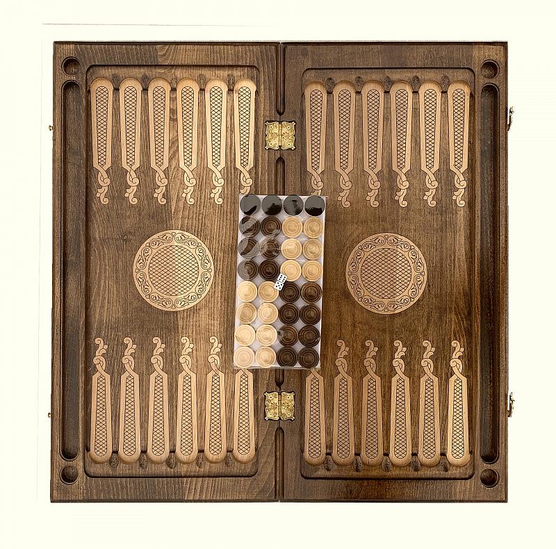 С внешней стороны доска украшена резным цветочным узором и полем для игры в шашки. Внутренний разворот – поле для нард, на котором также присутствует абстрактный витиеватый узор. Части доски скреплены между собой устойчивыми к износу медными петлями. От царапин деревянную поверхность защищает лак и подложки на каждой фишке.