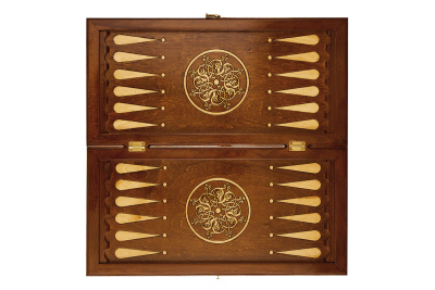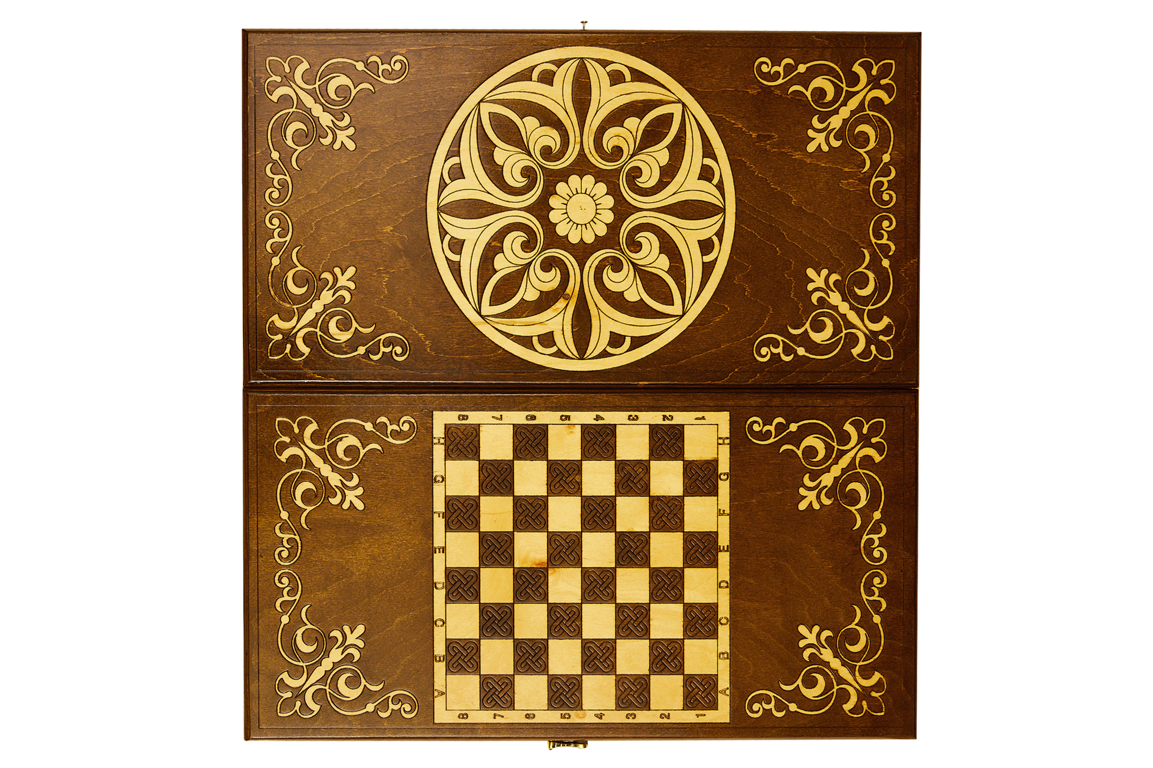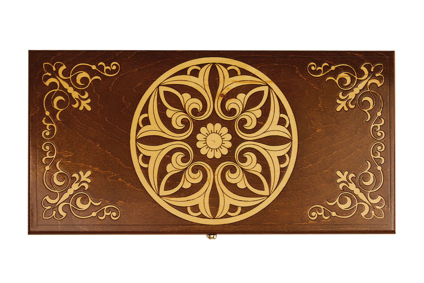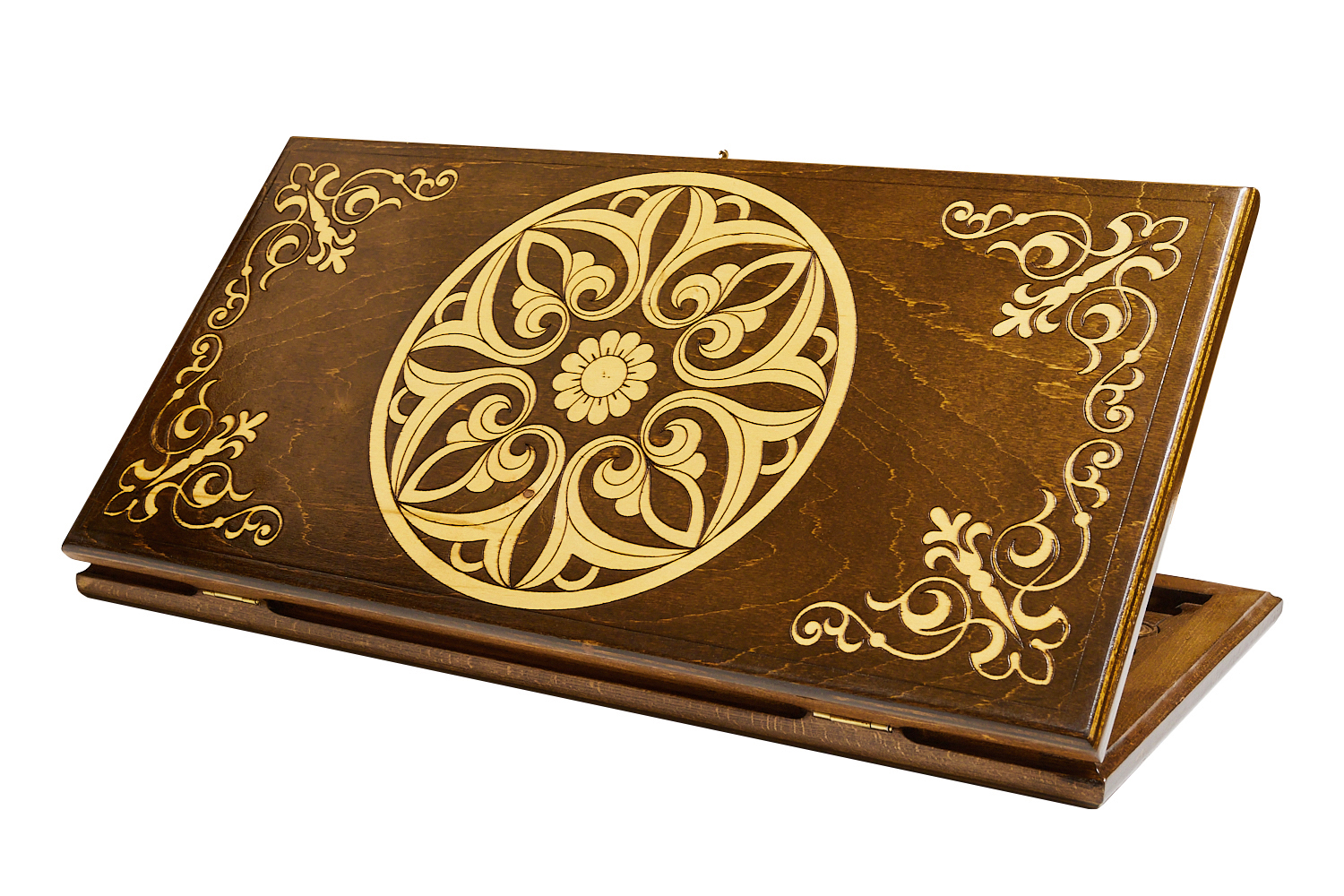 Красивый и удобный комплект нард «Узор», изготовленный знаменитым мастером Кареном Халеяном - отличный вариант презента для тех, кто увлекается старинными настольными играми, ставшими классикой. Доска, украшенная оригинальными резными узорами, выполнена из натуральной древесины высокого качества. Дополненная медной фурнитурой и лаковым покрытием, она надежна, долговечна и устойчива к износу.