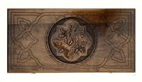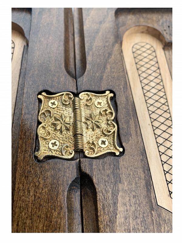 С внешней стороны доска украшена абстрактным узором с легко читаемыми растительными мотивами на одной стороне и полем для шашек – с другой. Внутренняя часть доски полностью отведена под нардовое поле. Медная фурнитура гарантирует устойчивость к износу и долговечность при частом использовании игрового набора.