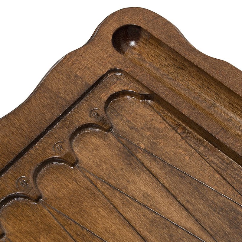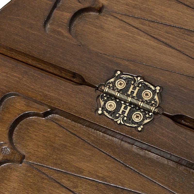 С лицевой поверхности глядит злобными глазами голова волка, покрытая мелким текстурированием и окруженная чем-то вроде веток с листьями. Задняя сторона представляет собой поле для игры в шашки, размером 8х8 клеток, для чего можно будет использовать комплектные фишки. Внутри, из украшений, только треугольники около каждой ячейки и подчеркнутая древесная текстура. На петлях присутствует изображение эмблемы мастера в виде буквы H. На боковой стороне есть ручка с вырезами под пальцы, что облегчает перенос, а также в комплекте есть защитный тканевый чехол.