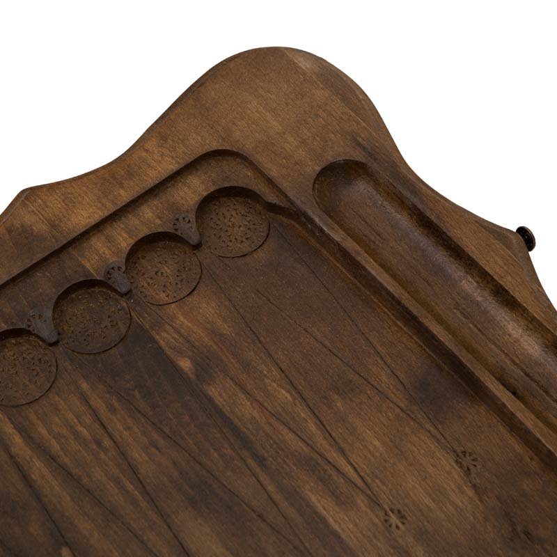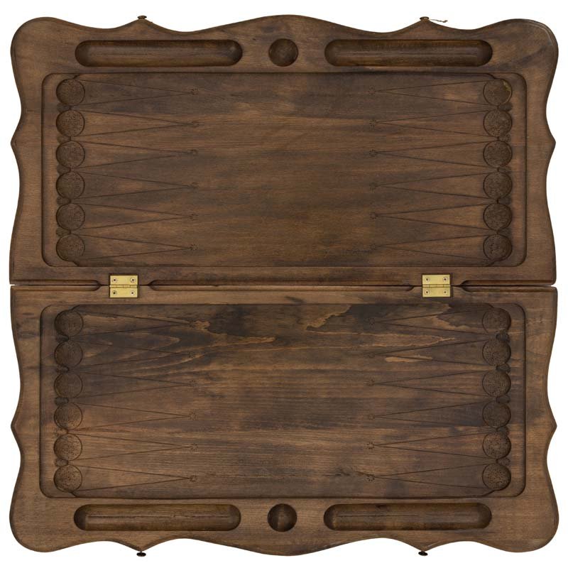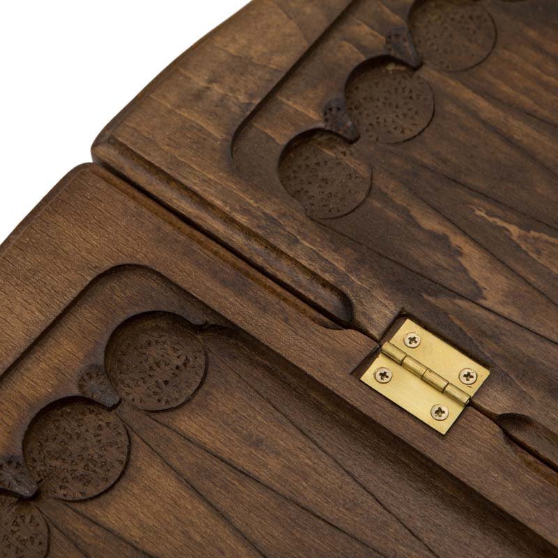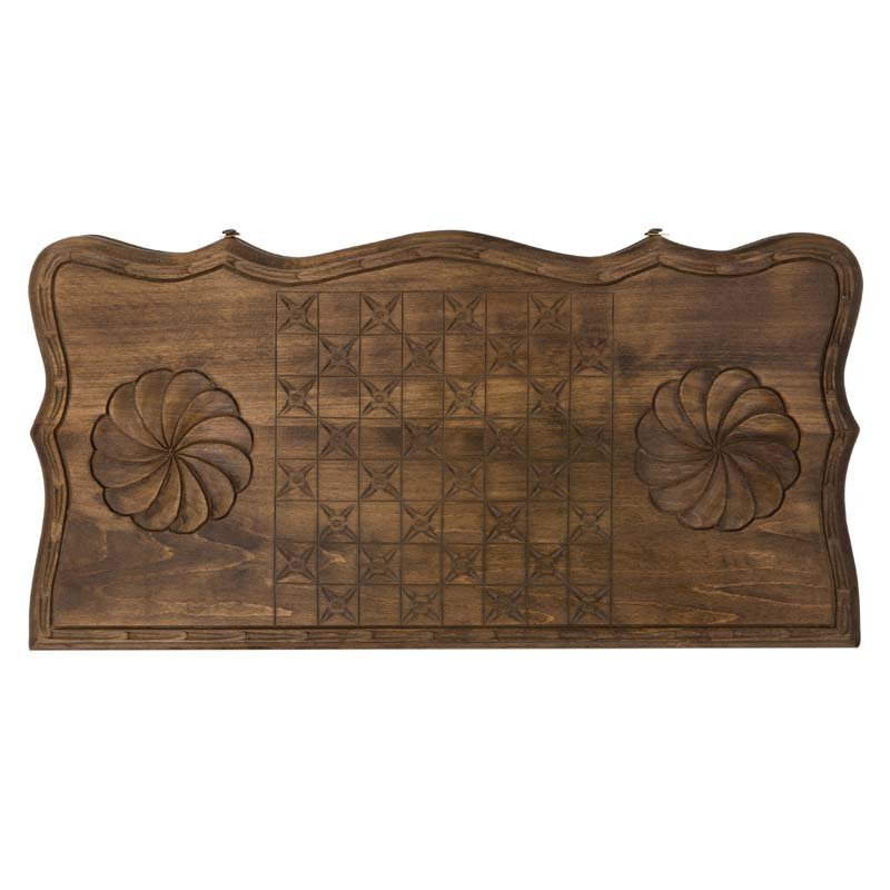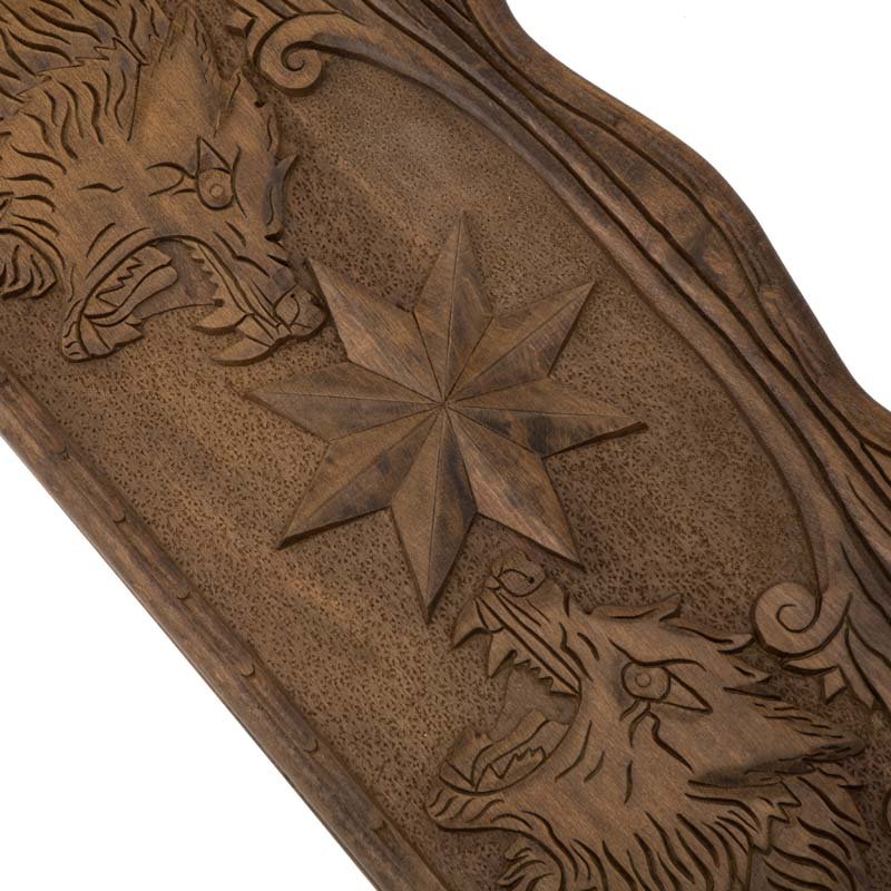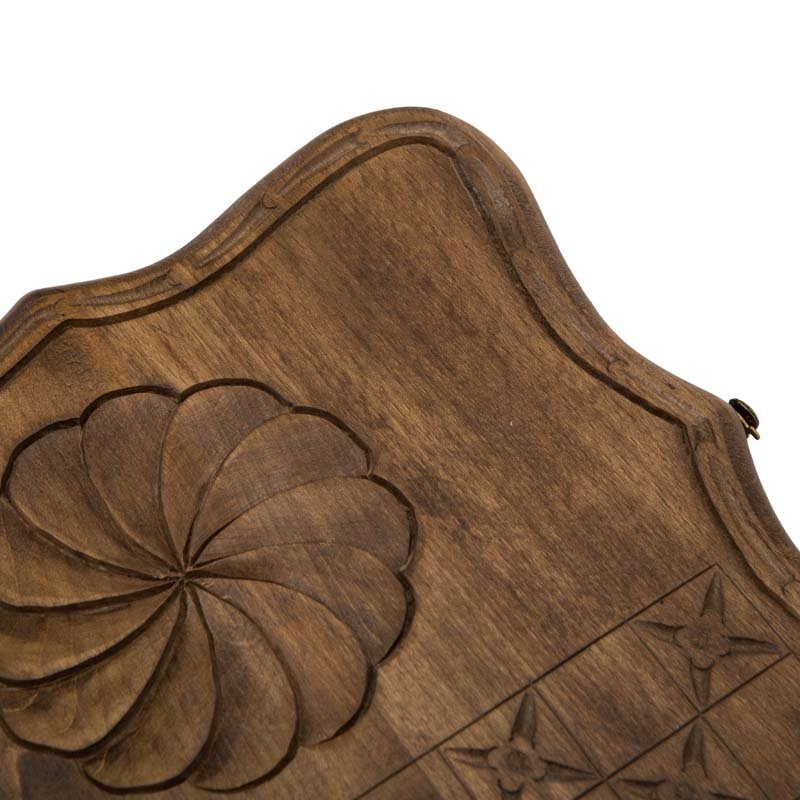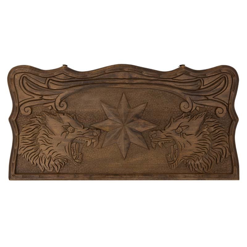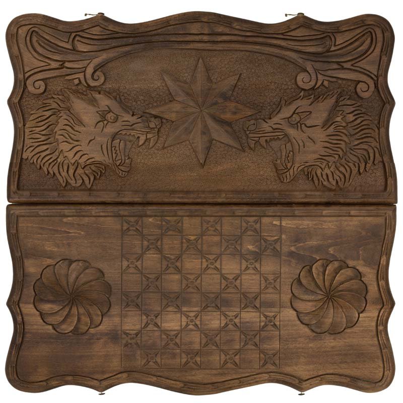 Сама доска не привычной, квадратной формы, а резная, с красивыми формами, напоминающими морскую волну. Внешняя поверхность створок украшена изображением звезды и ожесточенно смотрящих друг на друга волков. С другой - поле для игры в шашки, для чего можно будет использовать комплектные фишки. Внутри - каждая ячейка украшена собственным симметричным узором.