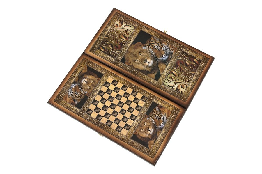 Недорогие нарды, выдержанные в сирийской тематике, представлены на данной странице нашего каталога. Они изготовлены российской компанией, называются «Сирия Львы» и представляют собой двойной комплект, позволяющий также играть в шашки. Для этого на одной из створок короба снаружи нанесена разметка квадратного поля для этой игры. Это поле заключено в орнаментальную рамку и окружено изображениями льва и тигра - в таких же рамках. Увеличенная копия этих изображений помещена на другую створку короба. Принты нанесены на древесину методом шелкографии и выдержаны в древесно-песочной гамме.
