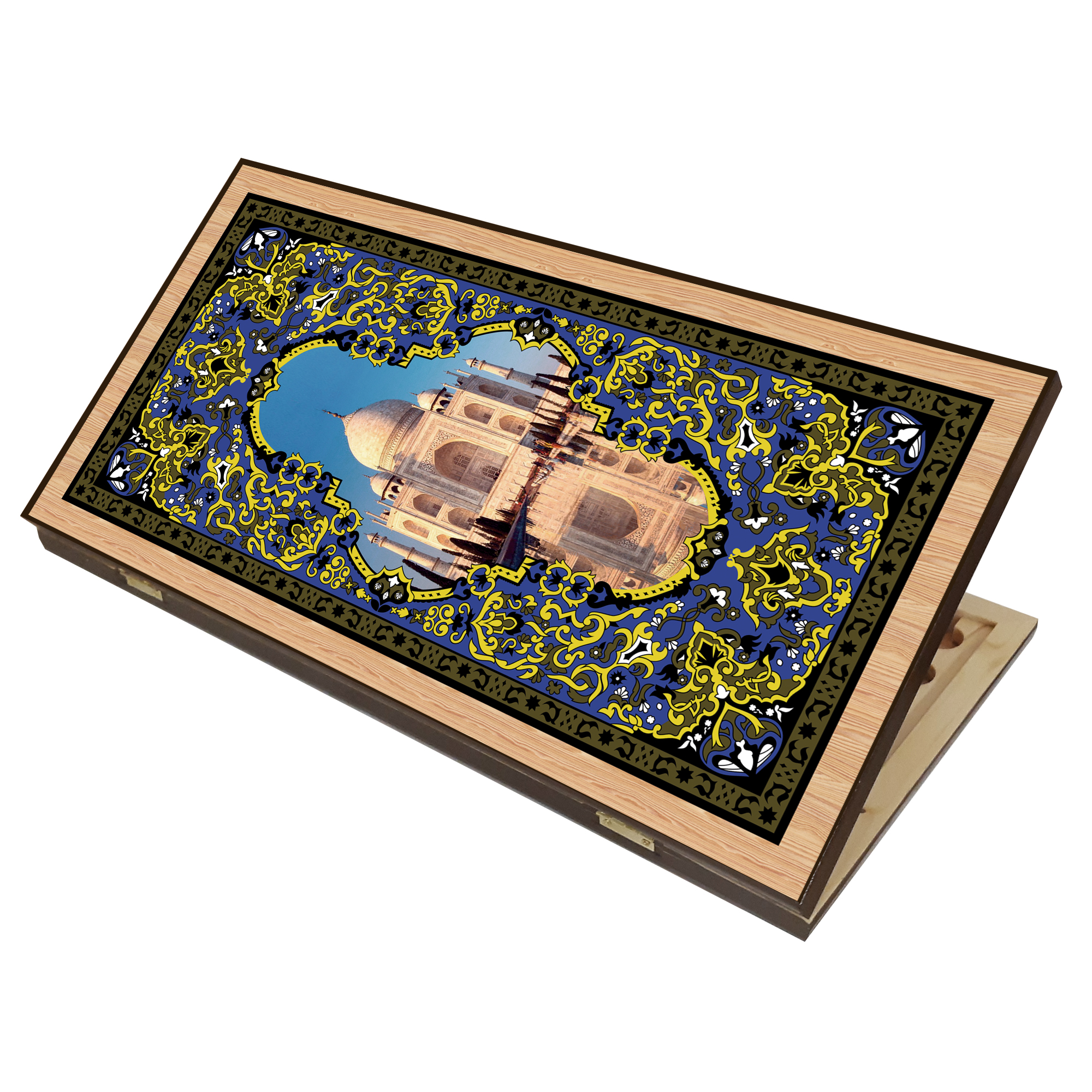 У нас можно приобрести двойной набор для игры в шашки и большие нарды «Тадж-Махал». Эти комплекты производит российская компания. Предлагаемый набор имеет эффектный и неповторимый внешний вид, а также отличается высоким качеством. Это действительно хороший пример декоративно-прикладного искусства. Внешняя поверхность крышки содержит полноцветное изображение знаменитого индийского мавзолея, отражающегося в водах пруда. Этот принт окружен красочным орнаментом. На другой створке на фоне такого же узора размещено поле для игры в шашки, а внутренняя поверхность короба размечена для нардов. Все изображения нанесены на дерево методом шелкографии.