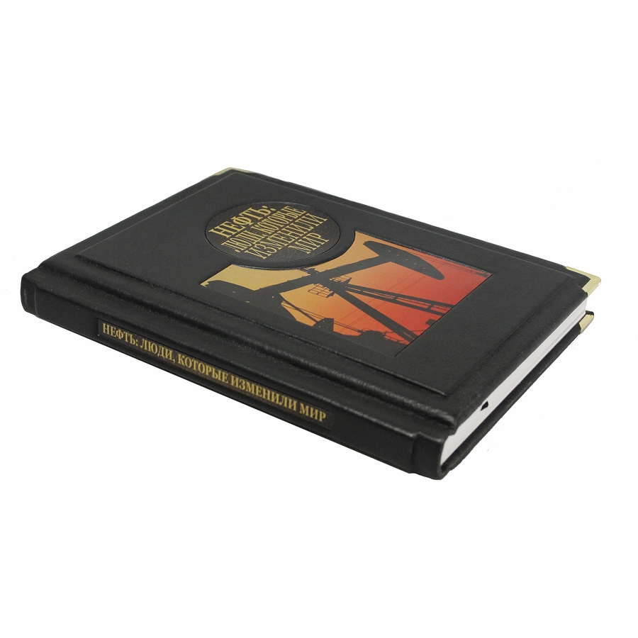 Цельнокожаный переплёт ручной работы, украшен иллюстрированной вставкой из цветного металла.