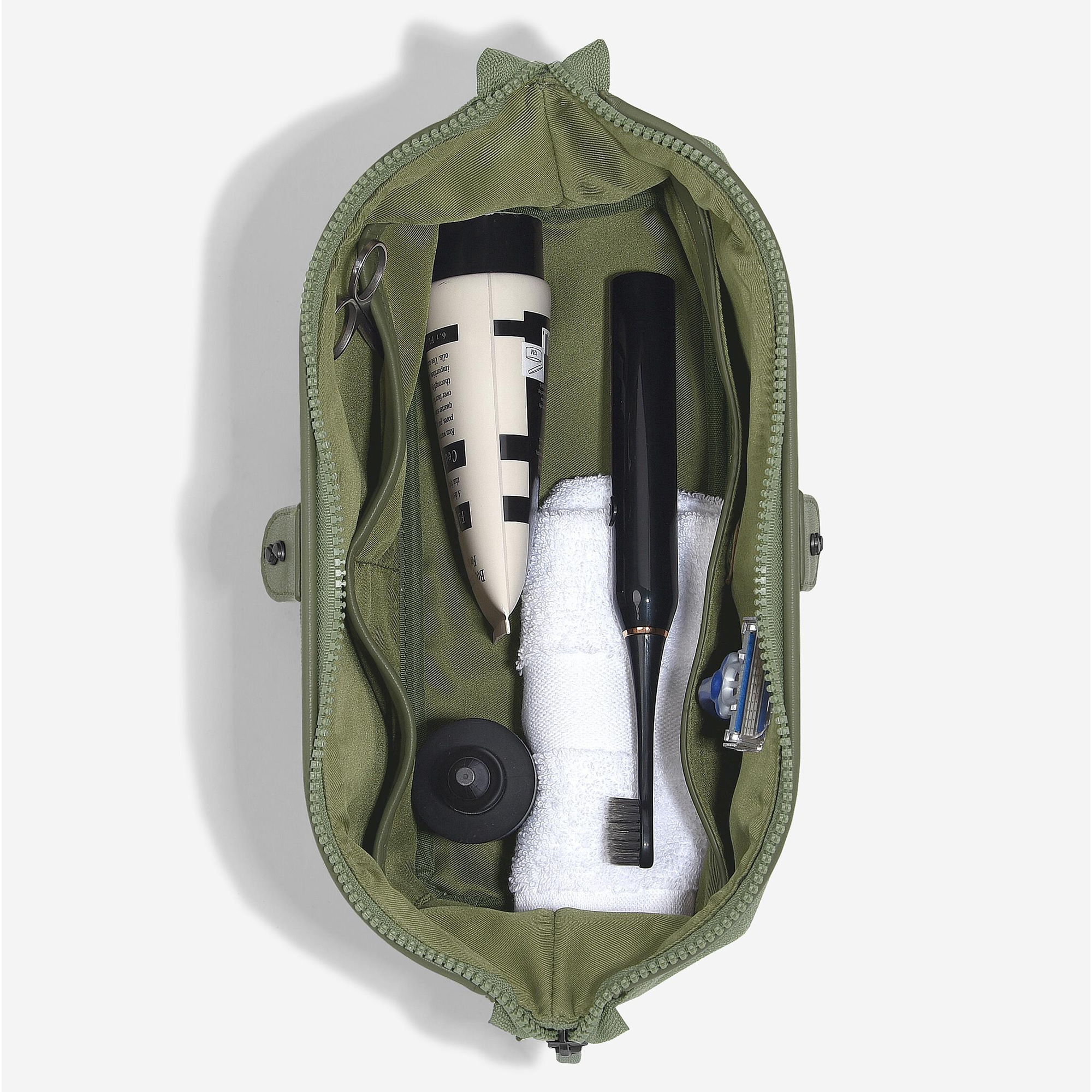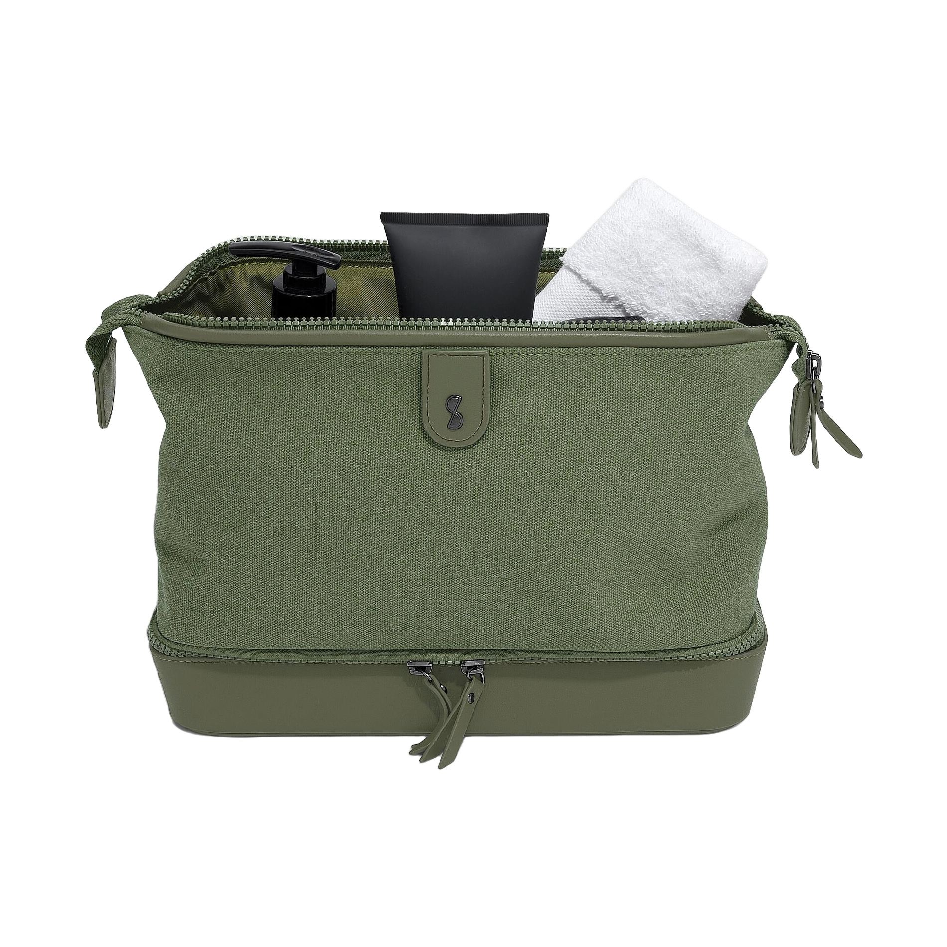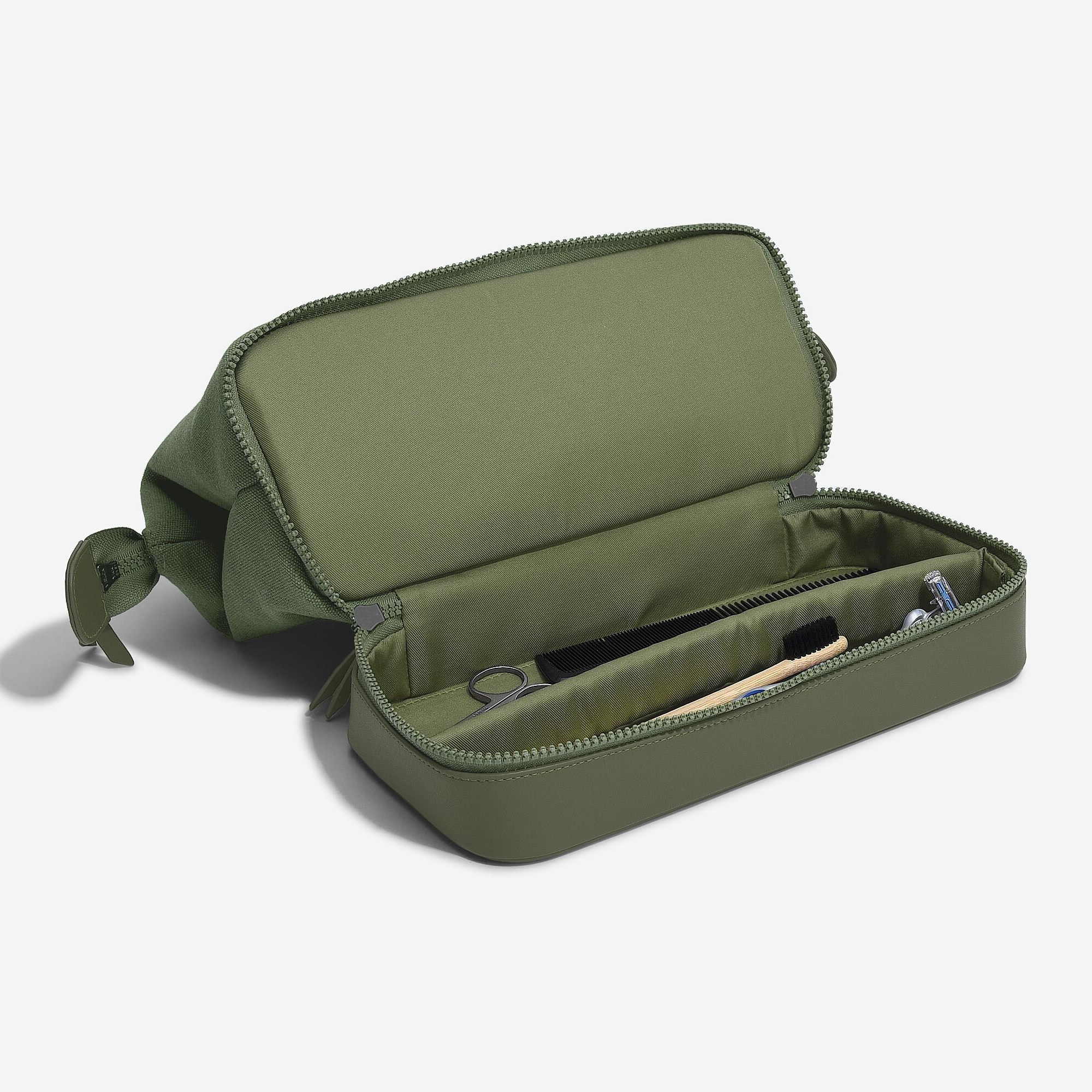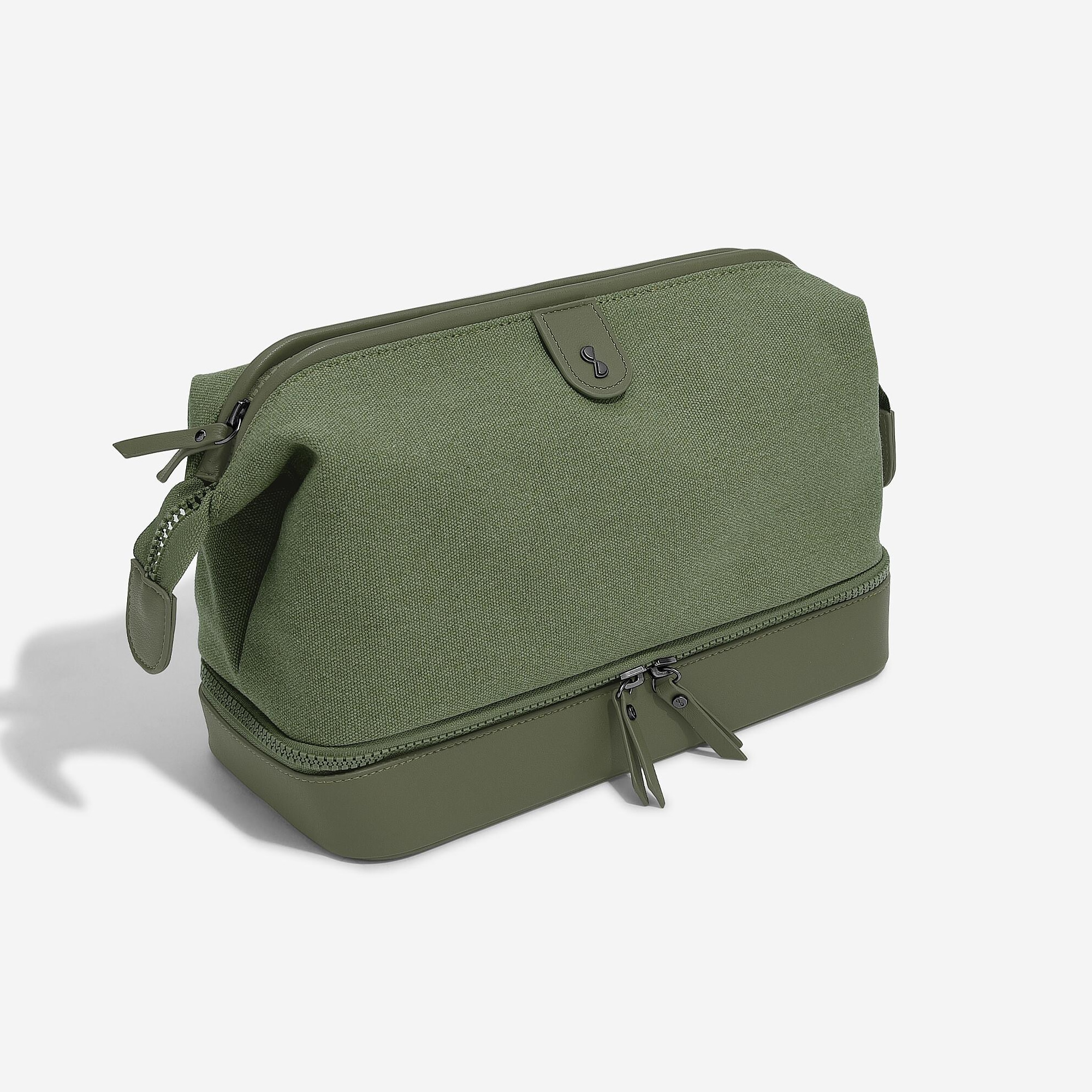 Сам же несессер изготовлен из высококачественной экокожи и плотной хлопчатобумажной ткани в стильной расцветке Green Canvas.