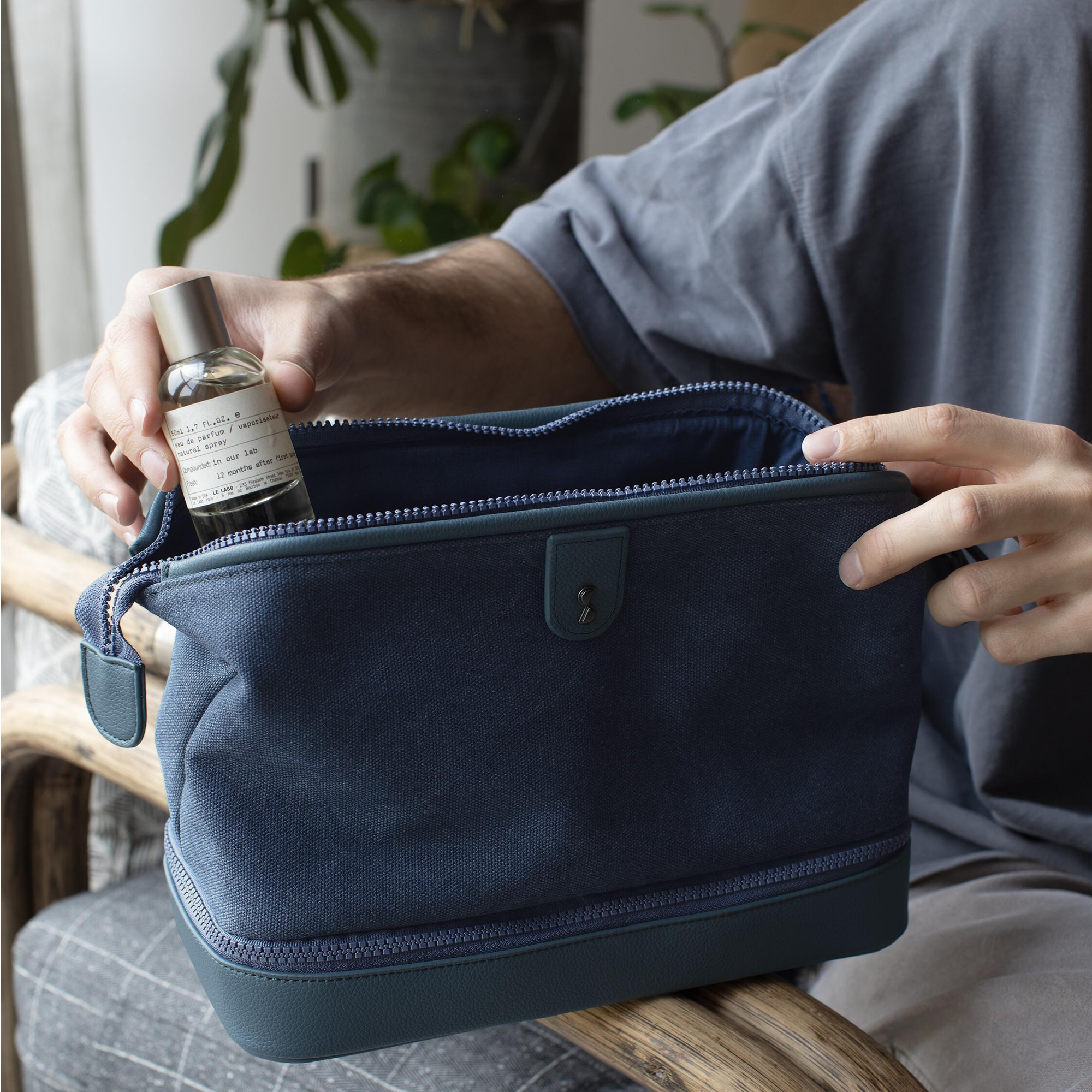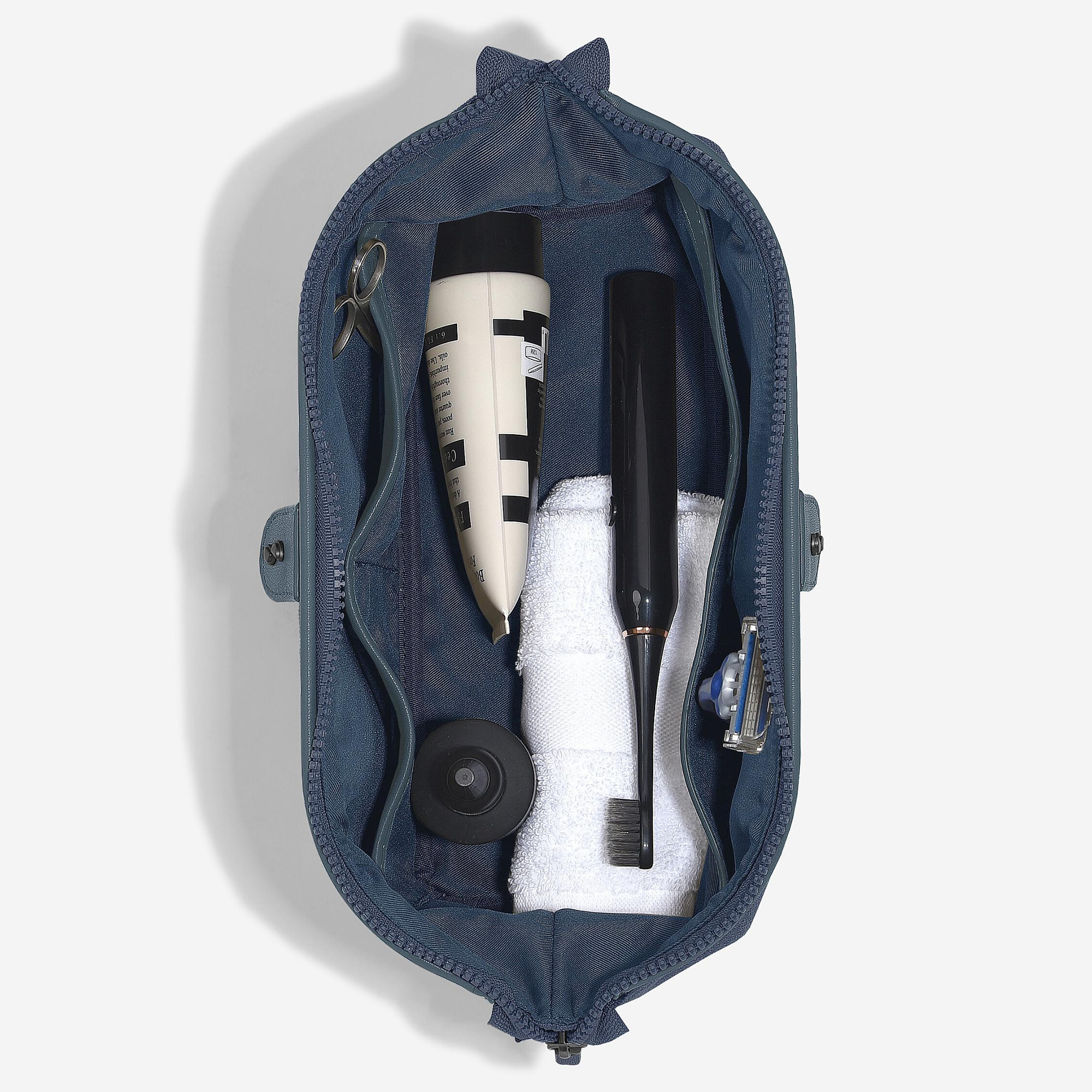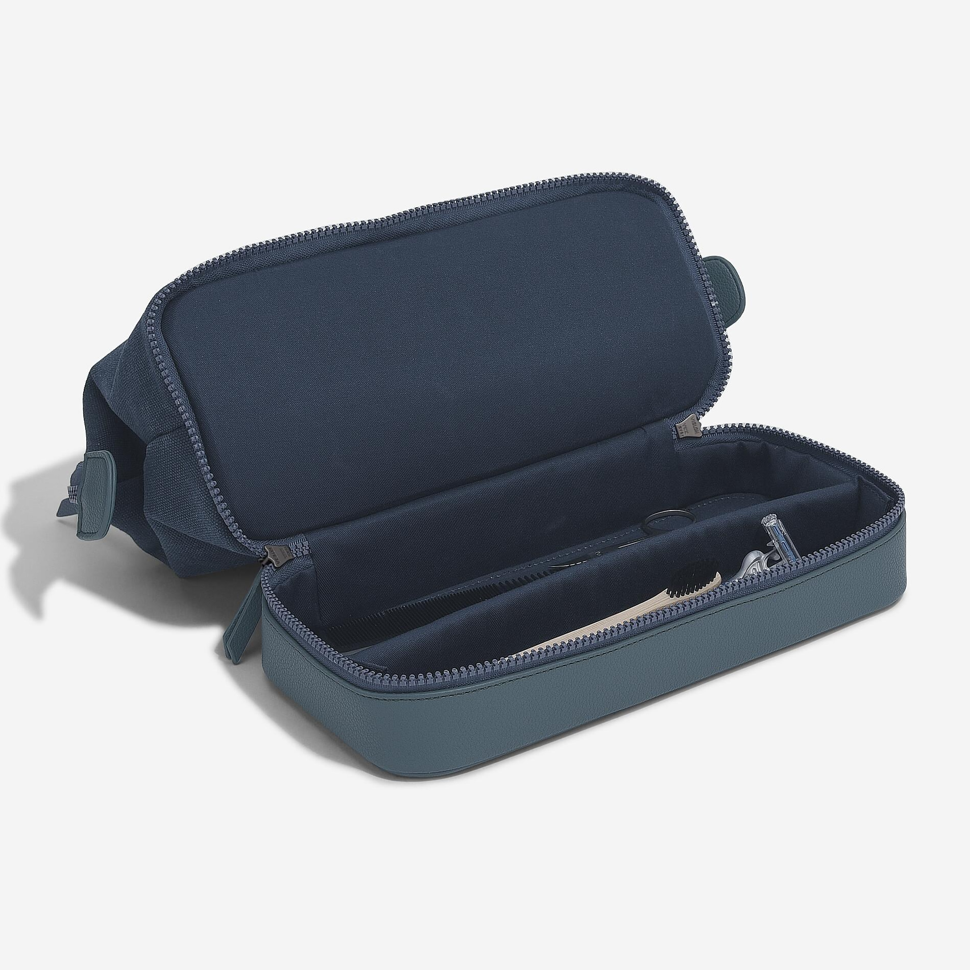 Внешний вид несессера сочетает в себе стильную экокожу и износостойкую хлопковую ткань синего цвета (Blue Canvas).