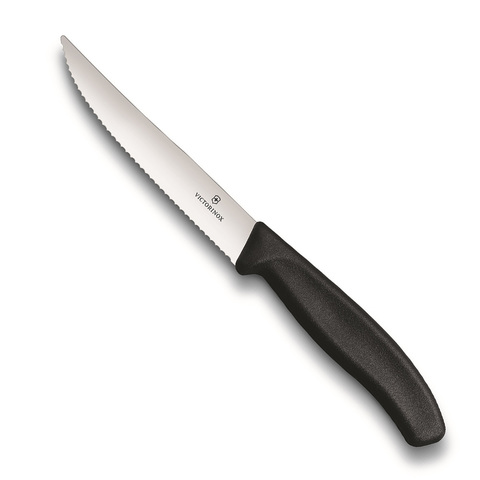 - Изготовленный в Швейцарии нож для стейка с волнистой кромкой лезвия.