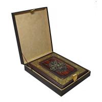 Дизайн прекрасно сочетает в себе золотое и бинтовое тиснение, художественную металлическую вставку, соответствующую тематике издания, а также крашенный в тон переплетного материала обрез.
