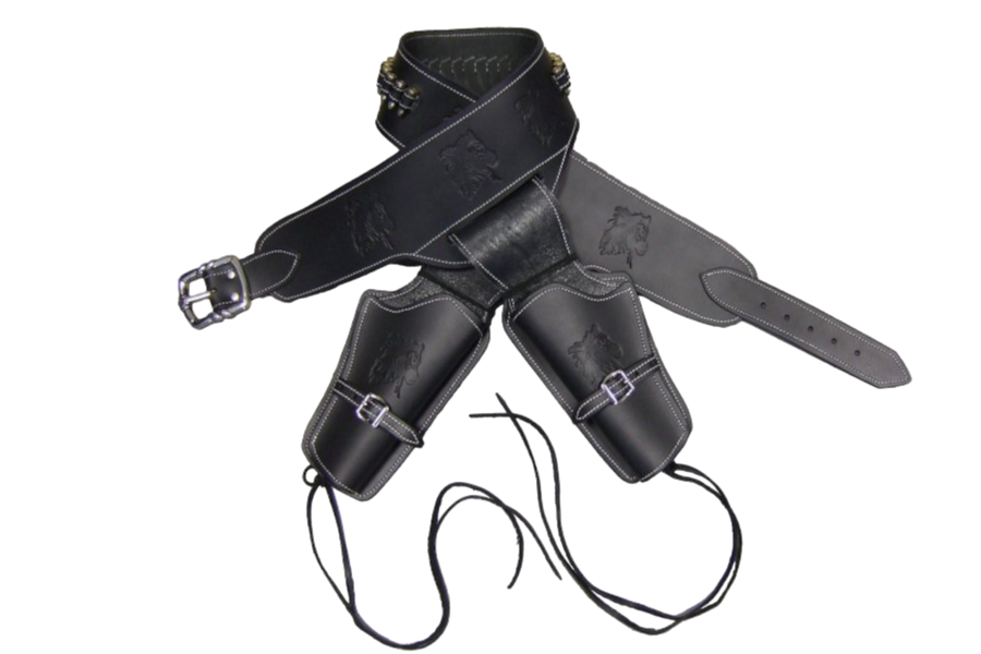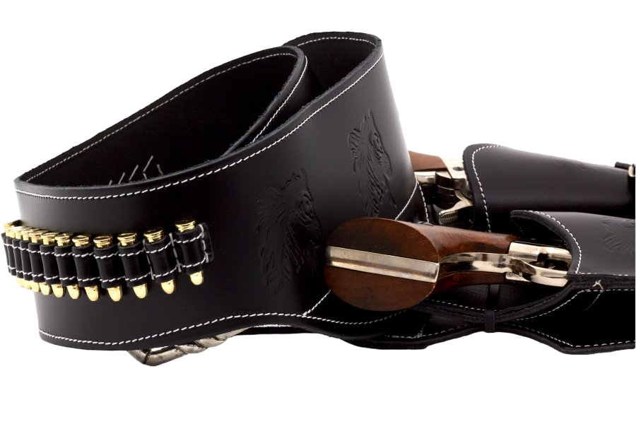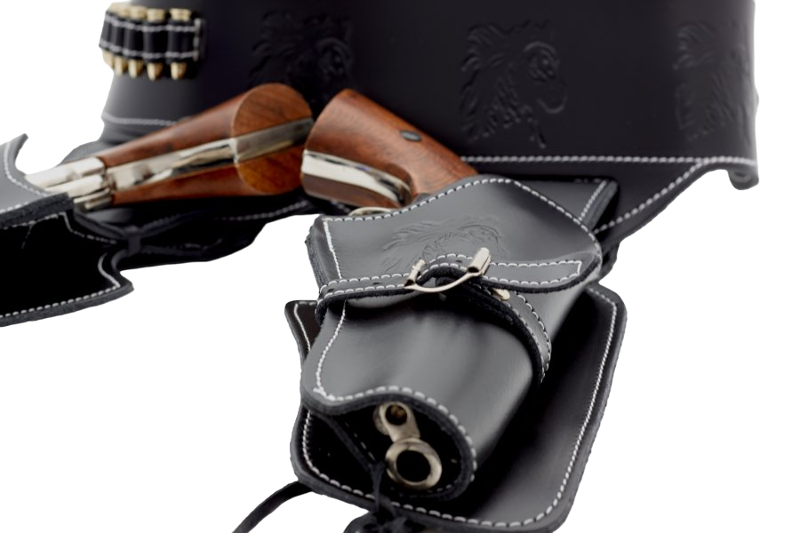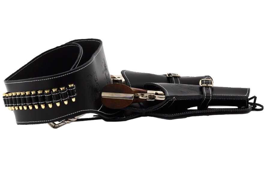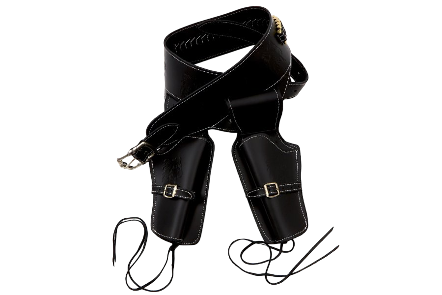 Кожаный патронташ для 2-ух револьвера с 24 пулями (пули в комплекте). На коже выполнено тиснение с рисунками мотивов Дикого Запада.