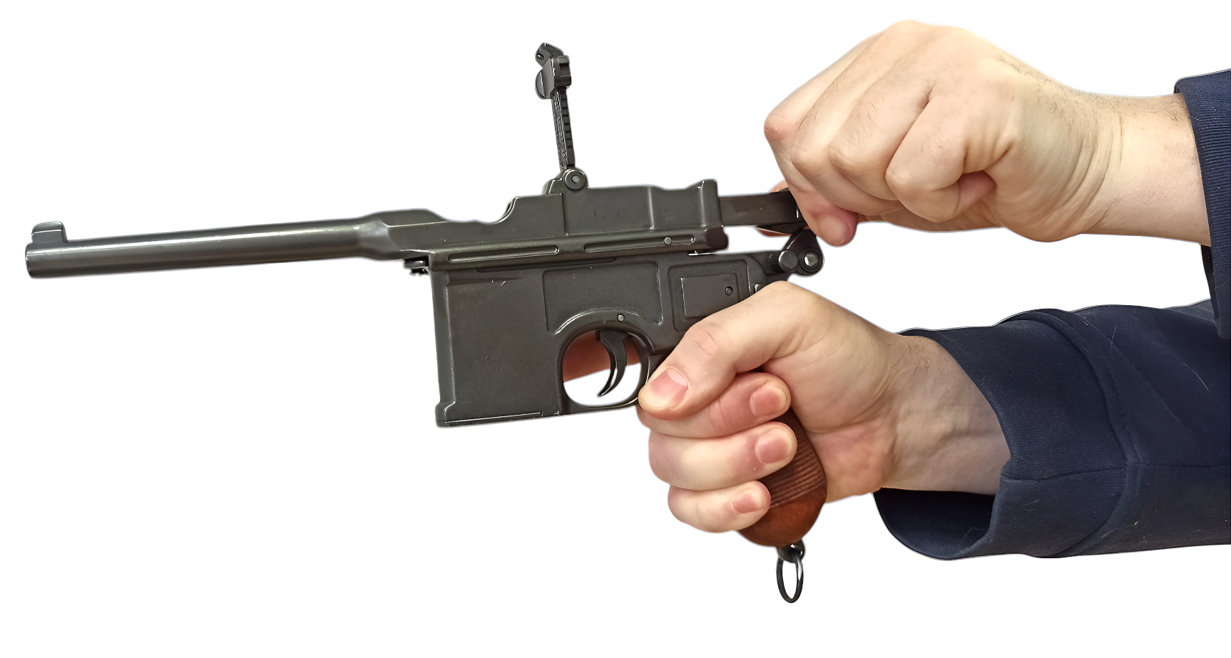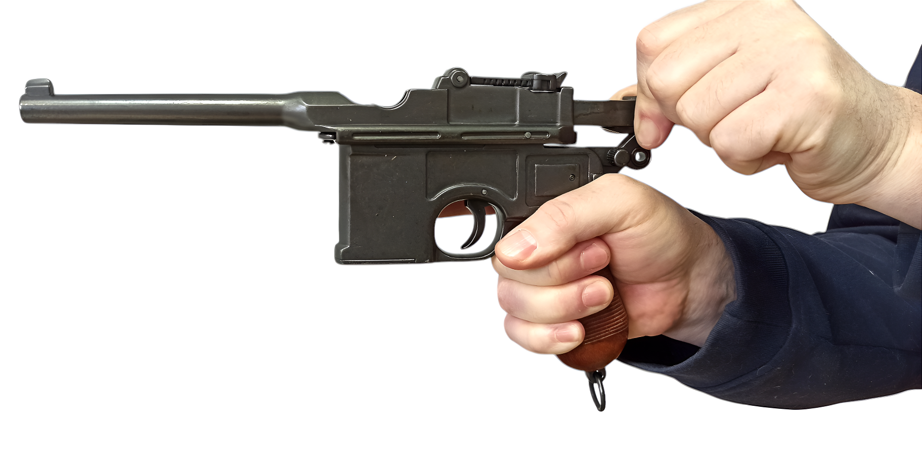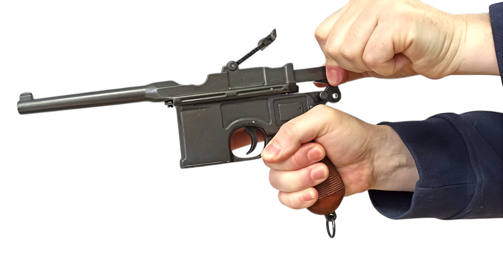Схема работы этих пистолетов — автоматика со свободным затвором. При стрельбе ствол неподвижный, однако, если производится разборка, он легко снимается. Ствол крепится к рамке довольно необычно – с помощью долинного стержня, который вставляется спереди под стволом, а также проходит через отверстия в упорах, сделанных на нижней поверхности ствола. Ударно-спусковой механизм несамовзводный (одинарного действия), ударниковый. Ручной предохранитель находится в вырезе щечек рукоятки слева. В конструкции предусмотрена затворная задержка, но ее выключение выполняется лишь вставлением очередного магазина. Защелка магазина находится в основании рукоятки. Компоновка пистолета «револьверная», поэтому его разборка немного необычна, коробчатый магазин находится перед спусковой скобой. Пистолет относится к самым мощным видам автоматических пистолетов, автоматика которых основана на применении энергии отдачи ствола короткого хода. Разборка пистолета показывает, что схема Маузера довольно удачна, у него высокая точность и дальность, хорошая живучесть в боевых условиях и мощные патроны. Однако есть у него и недостатки – это большие габариты и масса, схема, влияющая на сложность перезаряжания.