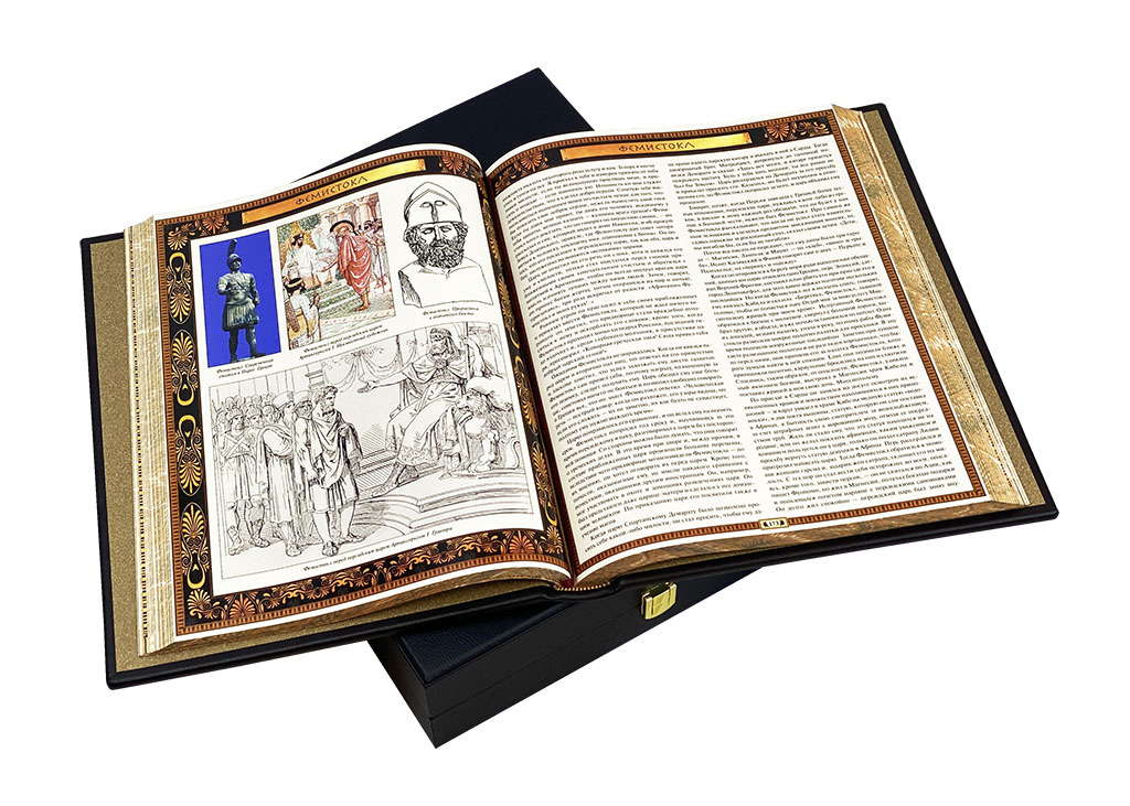 Дизайн прекрасно сочетает в себе золотое и блинтовое тиснение, художественную металлическую вставку, соответствующую тематике издания, а также крашенный в тон переплетного материала обрез.