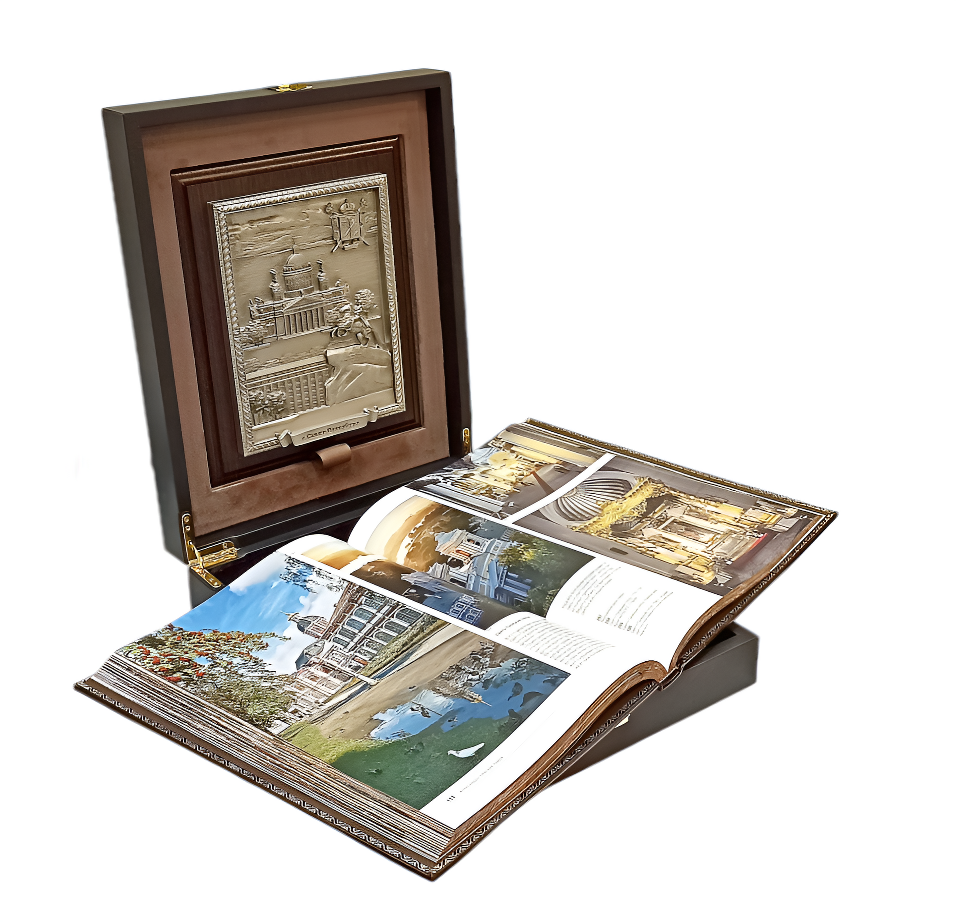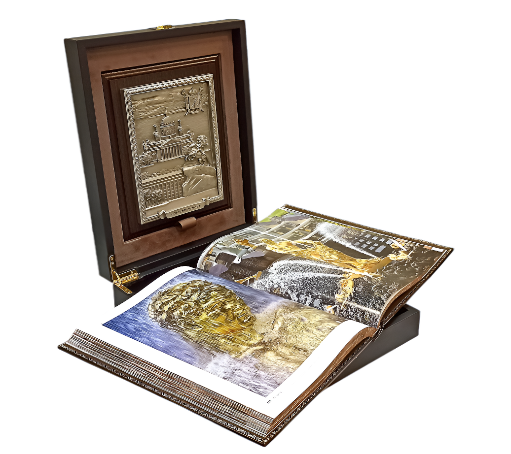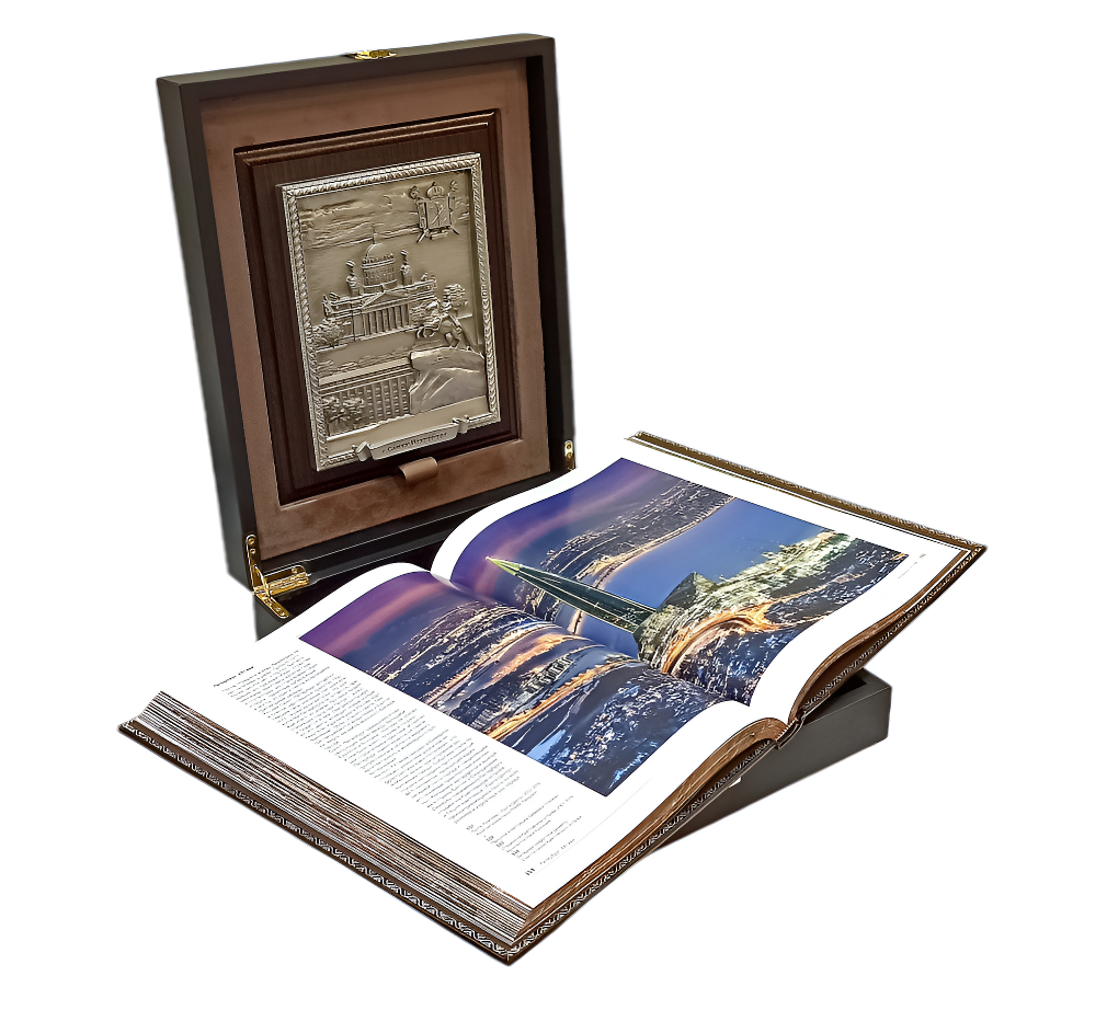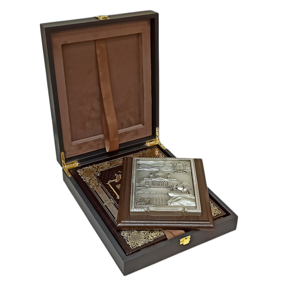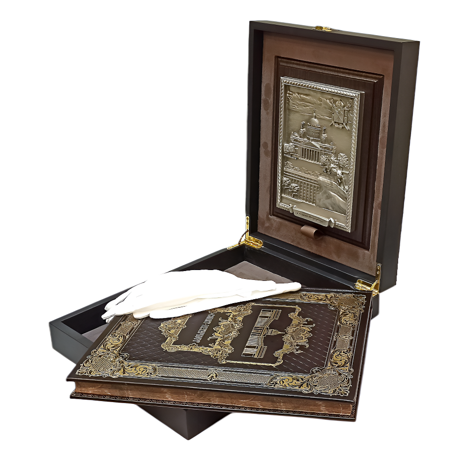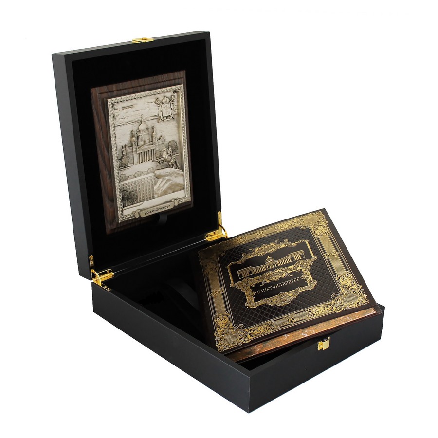 Оригинальный подарочный набор включает в себя книгу в кожаном переплете "Санкт-Петербург" и плакетку, оформленных в деревянной коробке, обтянутой кожей.