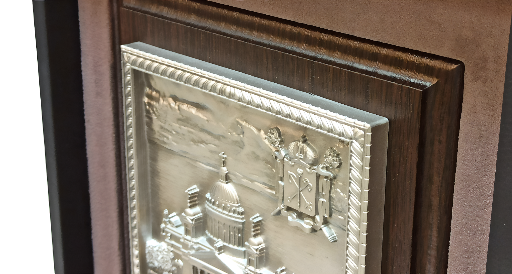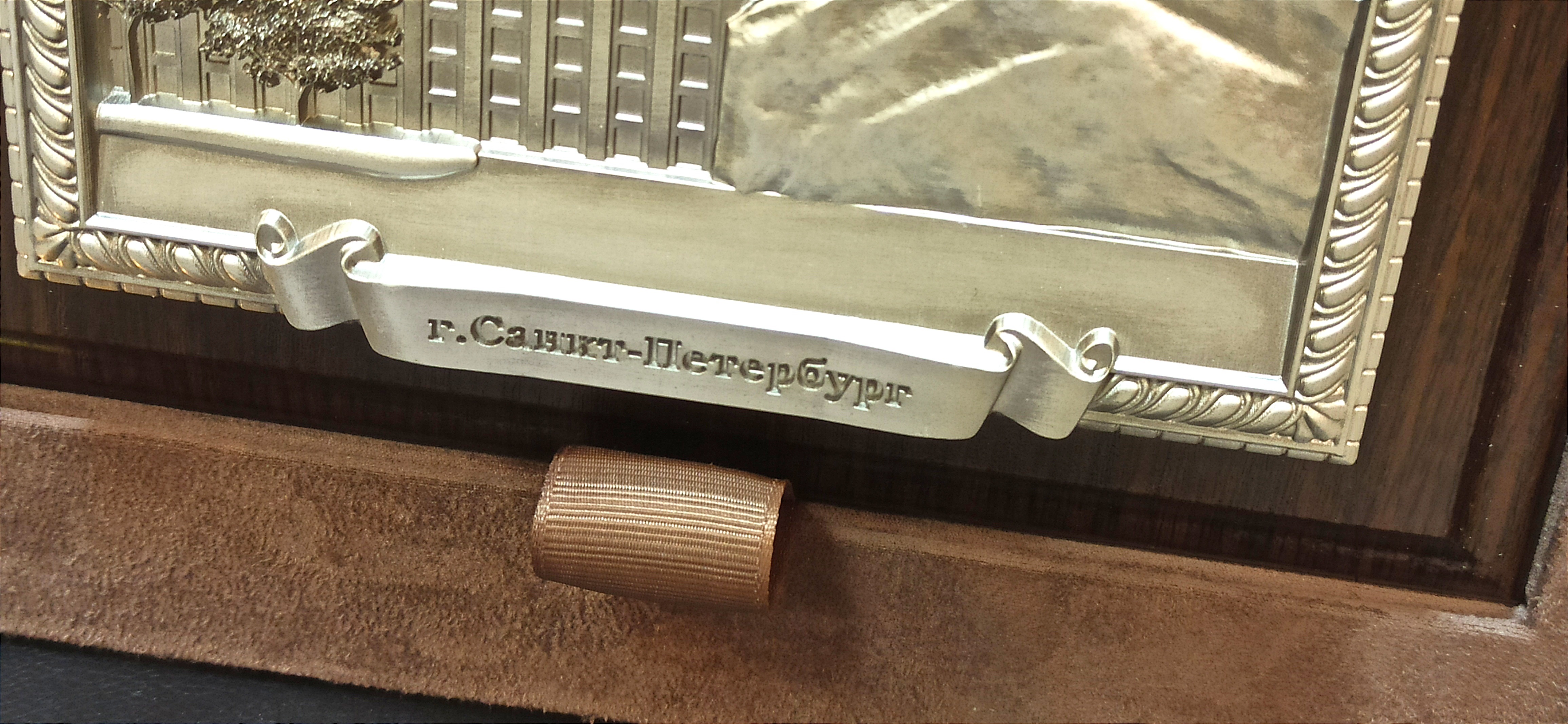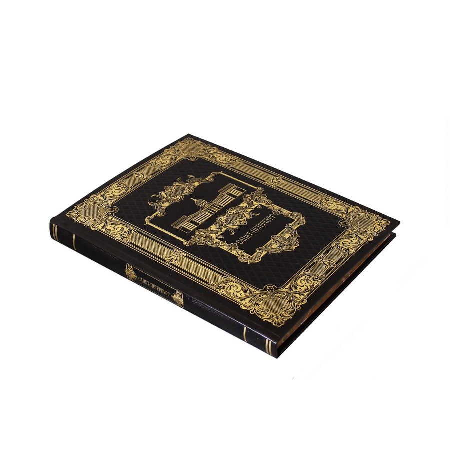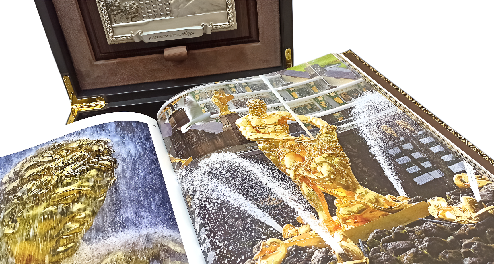 Оригинальный подарочный набор включает в себя книгу в кожаном переплете "Санкт-Петербург" и плакетку, оформленных в деревянной коробке, обтянутой кожей.