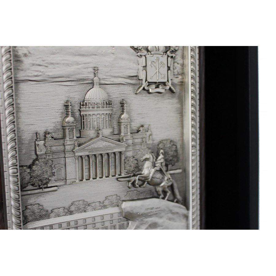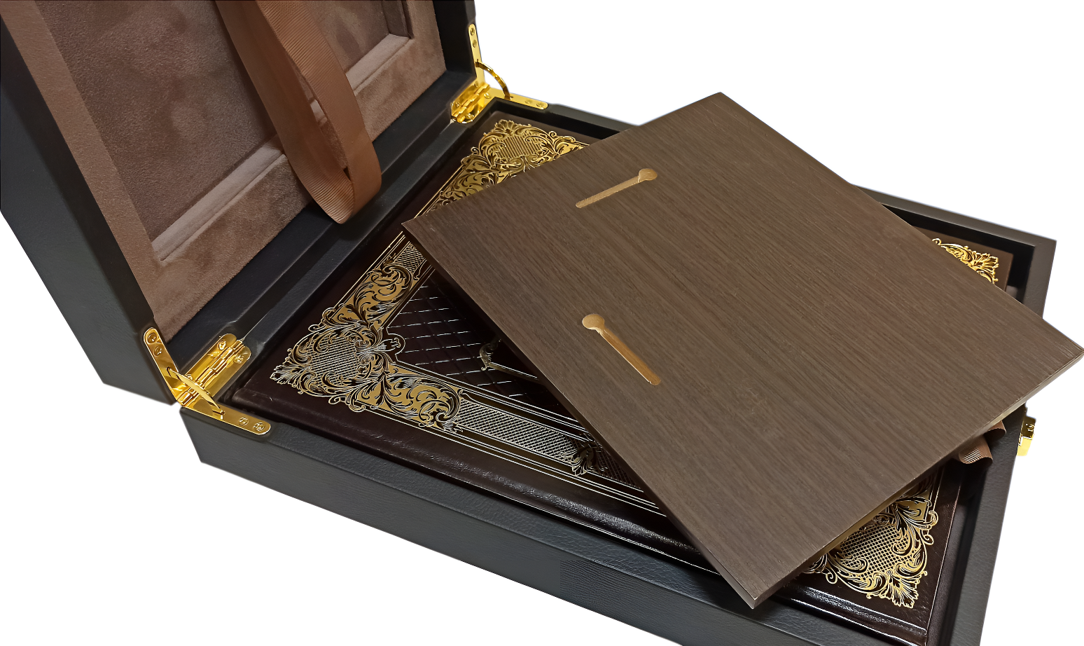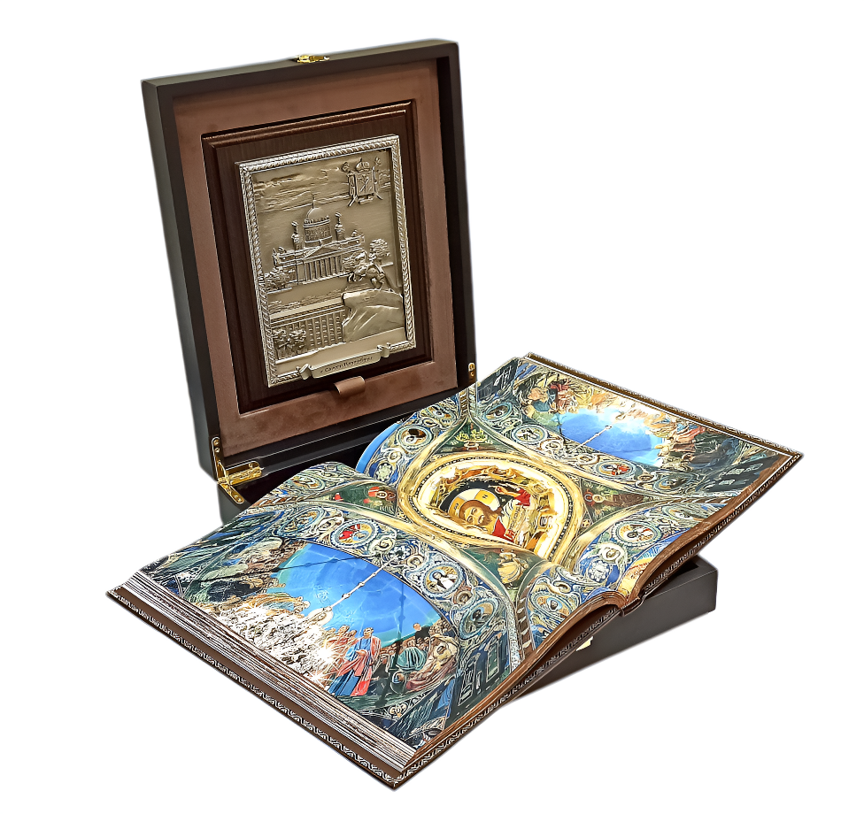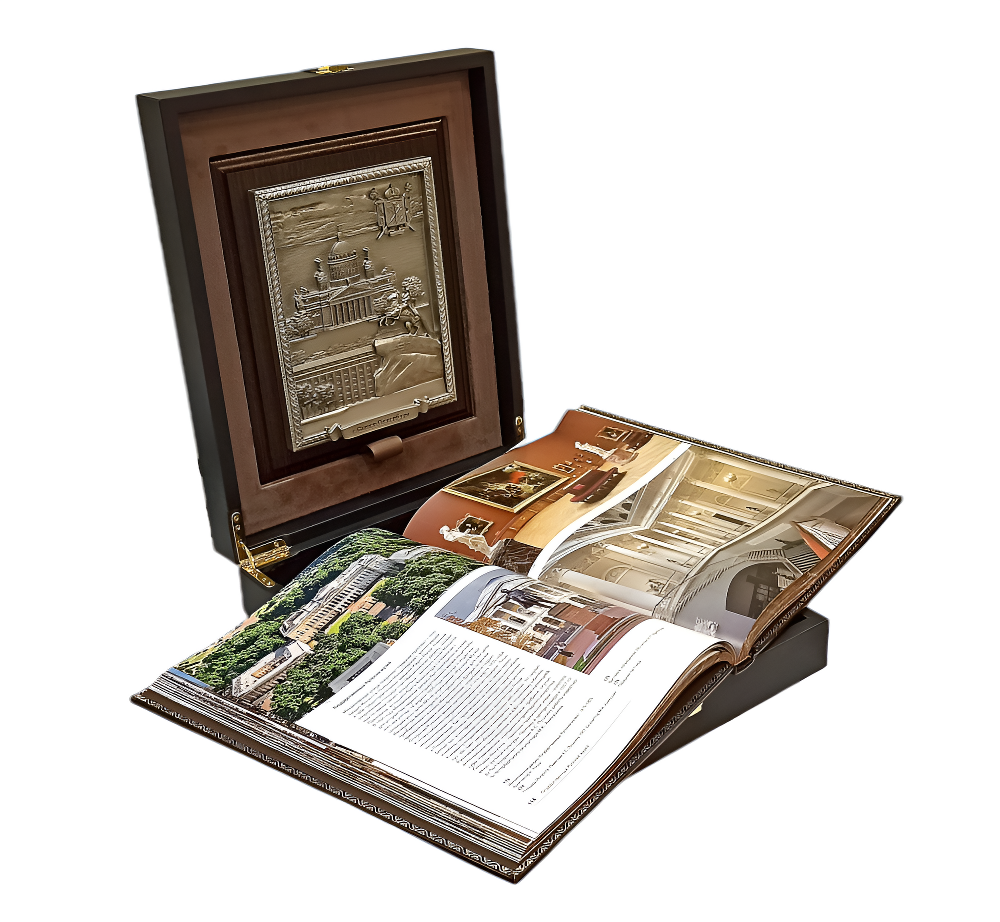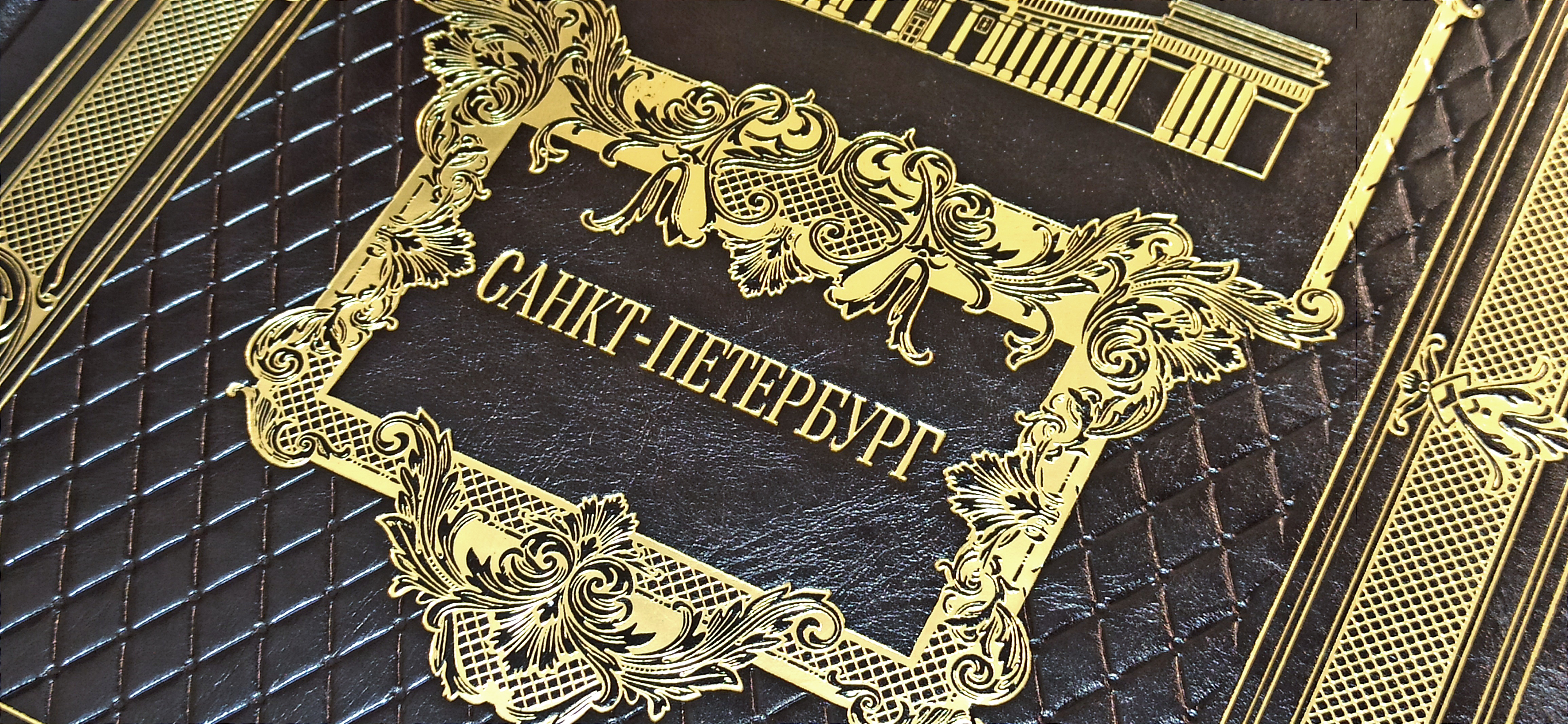 Оригинальный подарочный набор включает в себя книгу в кожаном переплете "Санкт-Петербург" и плакетку, оформленных в деревянной коробке, обтянутой кожей.