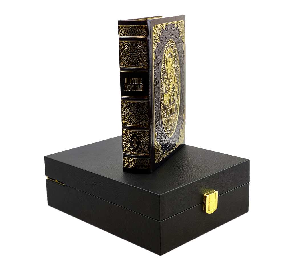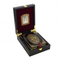 Оригинальный подарочный набор включает в себя книгу в кожаном переплете «Цветник духовный» и икону «Святая Троица», оформленных в деревянном коробе с ложементом из флока, обтянутом кожей.