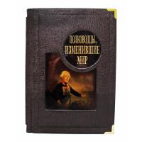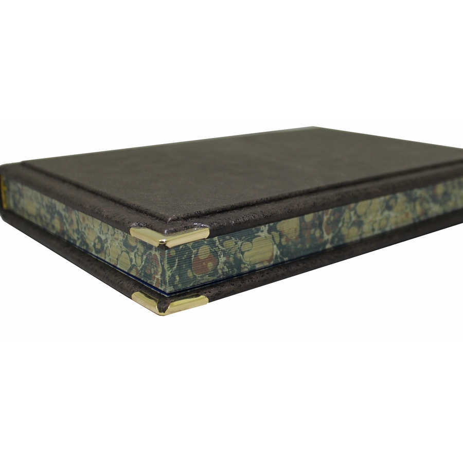 Цельнокожаный переплёт ручной работы, украшен иллюстрированной вставкой из цветного металла.