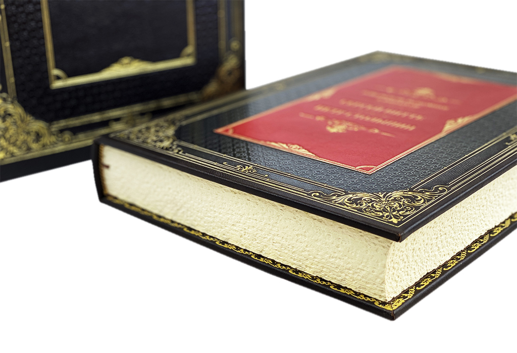 Цельнокожаный переплёт ручной работы, украшен цветной кожаной вставкой, а также золотым и блинтовым тиснением.