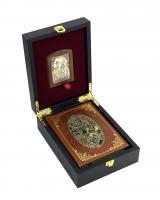 Оригинальный подарочный набор включает в себя книгу в кожаном переплете «Притчи» и икону «Казанской Божией Матери», оформленных в деревянной коробке, обтянутой кожей.