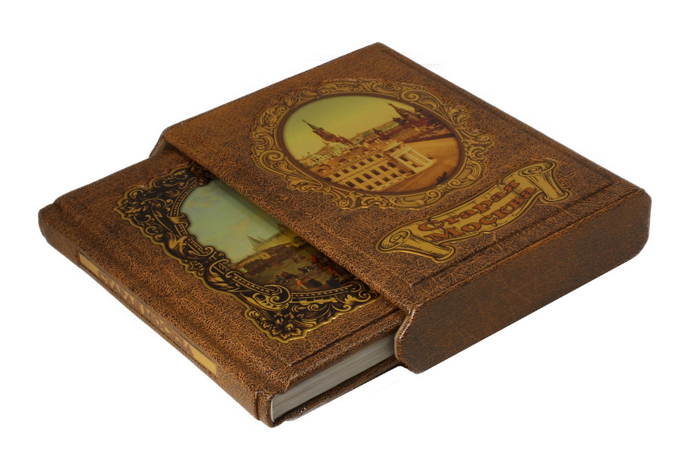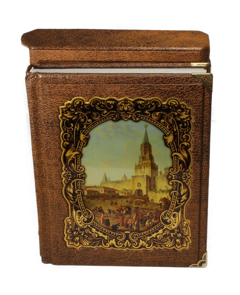 Цельнокожаный переплёт ручной работы, украшен иллюстрированной вставкой из цветного металла.