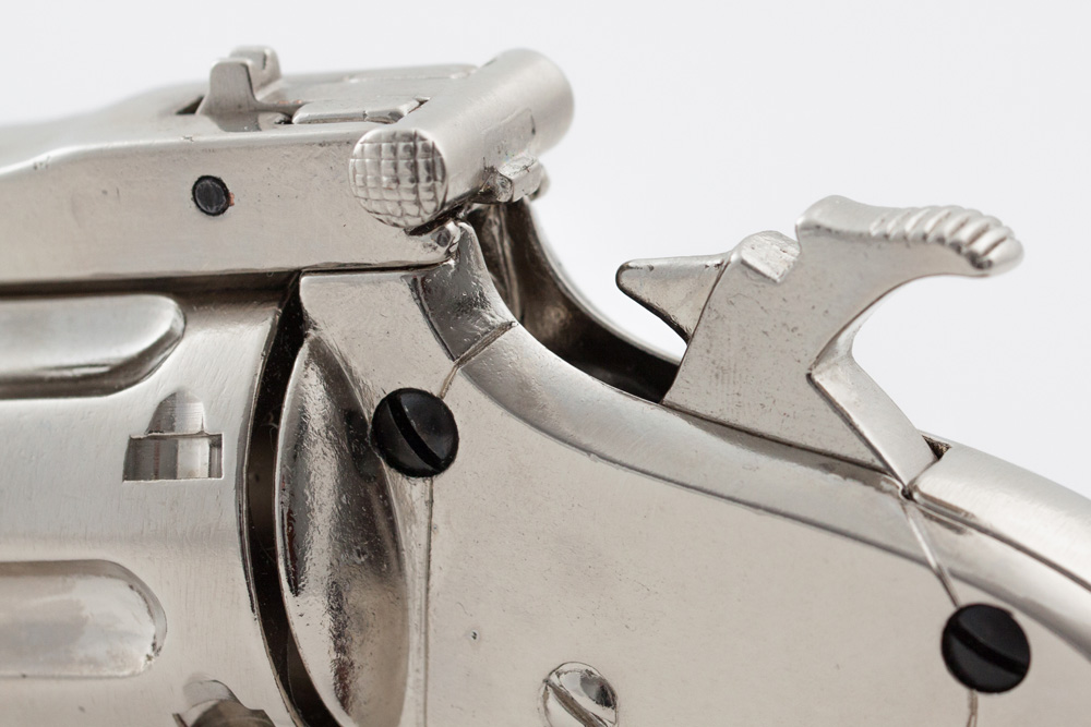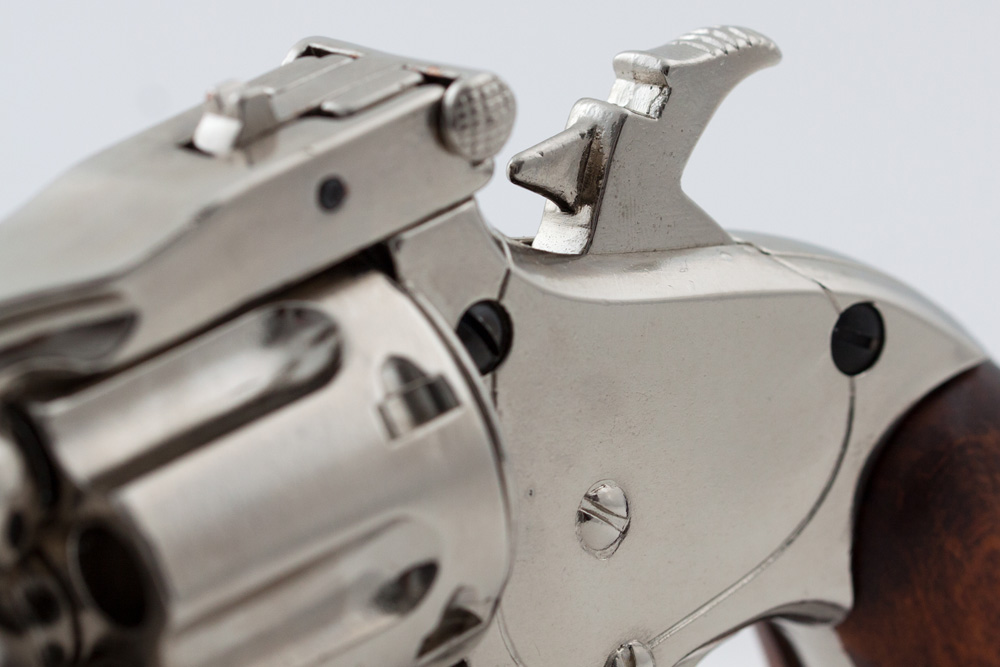 Макет выполнен из металлического сплава и никеля. Из дерева здесь выполнены накладки на рукоятку. В этой конструкции подвижный барабан, ствол переламывается, нажимается курок, можно выполнить взведение.