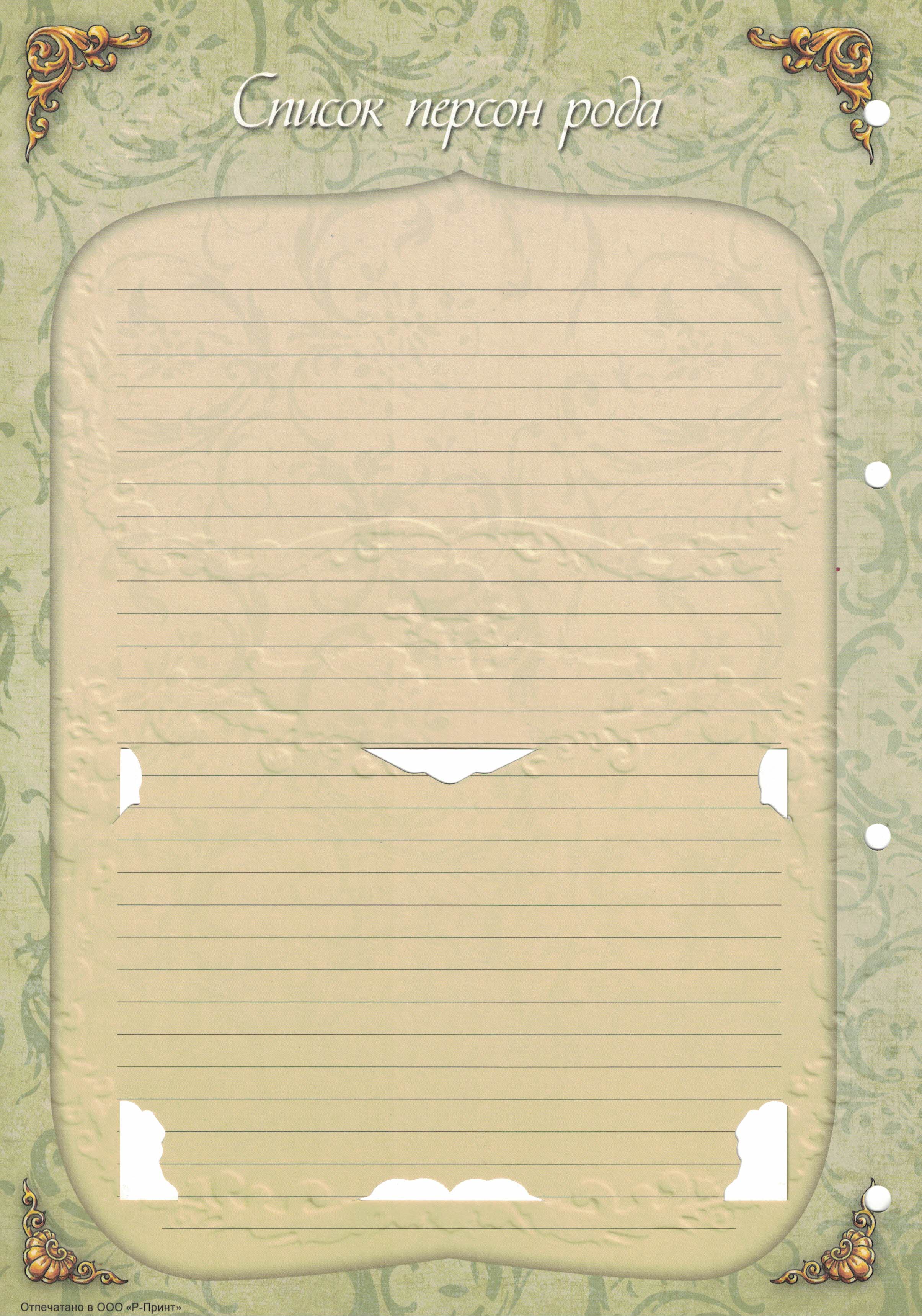 - Внутренний художественный блок листов (12 указателей родов, 50 бланков для заполнения Персональных листов, 12 календарей памятных дат);