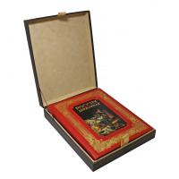 Дизайн прекрасно сочетает в себе золотое и бинтовое тиснение, художественную металлическую вставку, соответствующую тематике издания, а также крашенный в тон переплетного материала обрез.