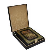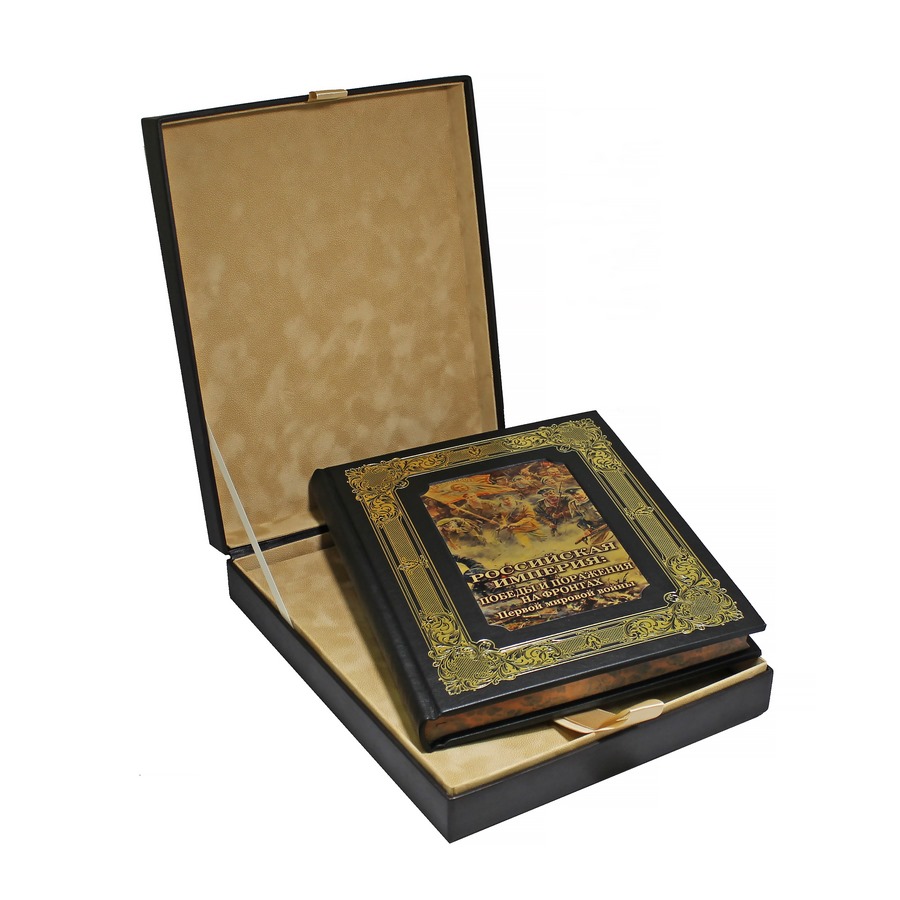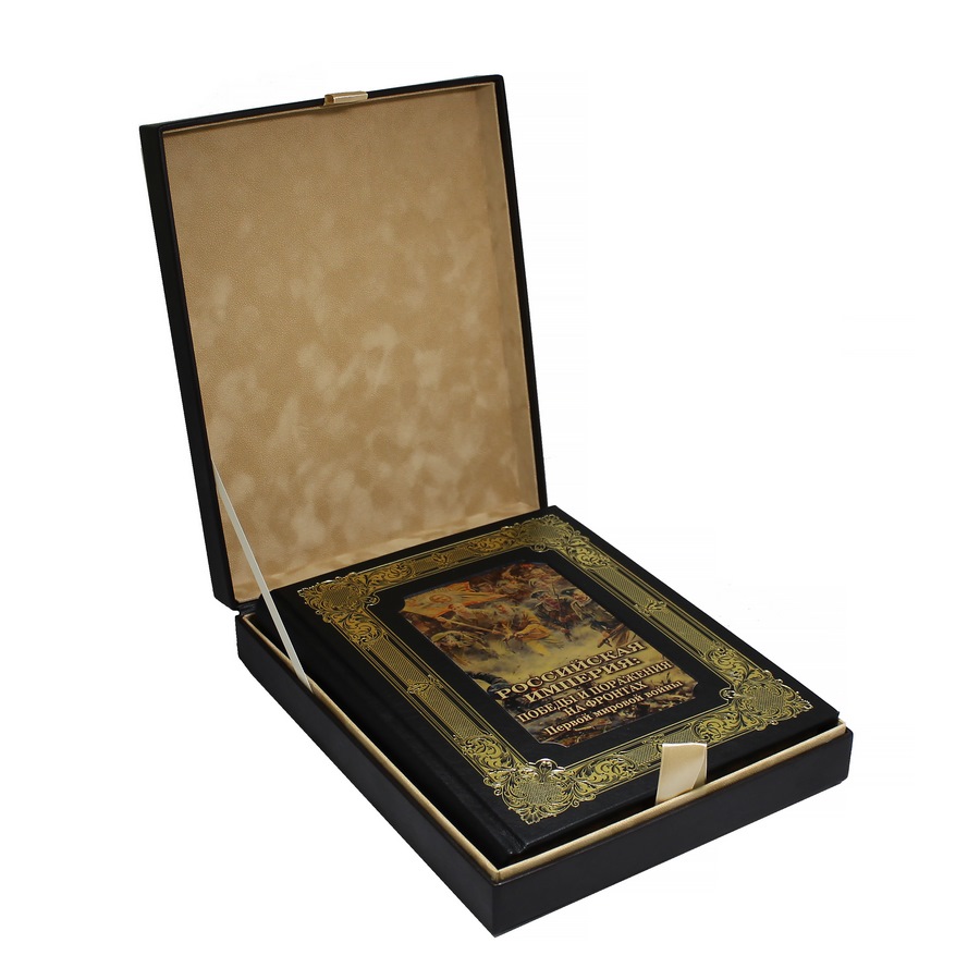 Дизайн прекрасно сочетает в себе золотое тиснение и художественную металлическую вставку, соответствующую тематике издания, а также крашенный в тон переплетного материала обрез.