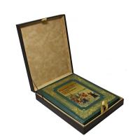 Дизайн прекрасно сочетает в себе золотое и бинтовое тиснение, художественную металлическую вставку, соответствующую тематике издания, а также крашенный в тон переплетного материала обрез.