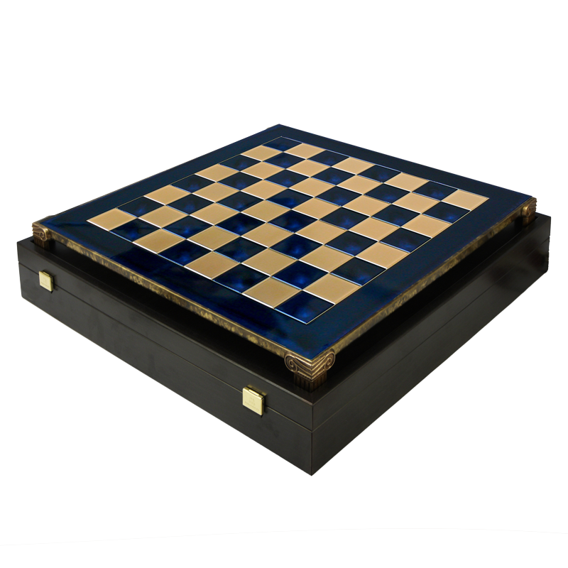 В этом наборе шахматная доска – синяя; фигуры цвета золото и серебро.