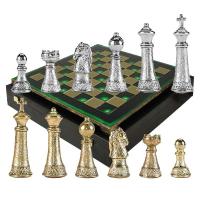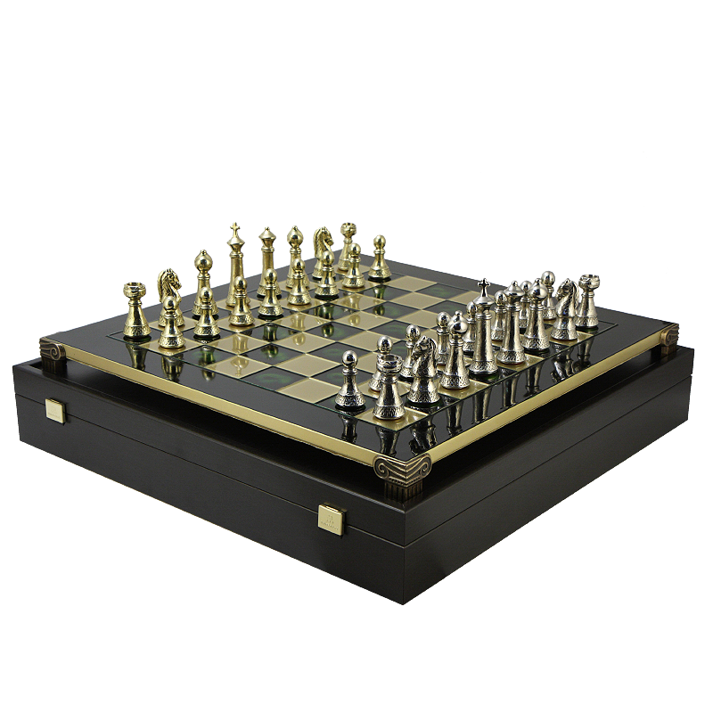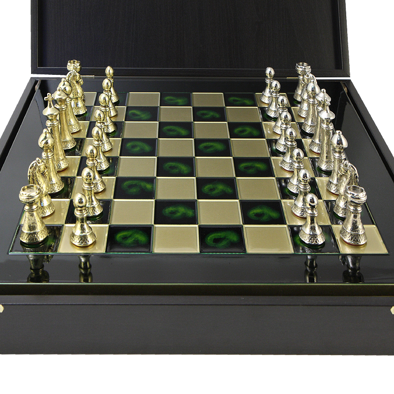 В этом наборе шахматная доска – зеленая; фигуры цвета золото и серебро.