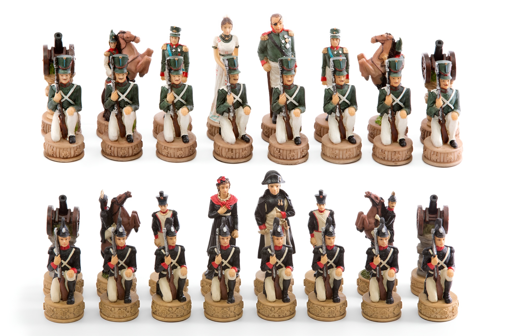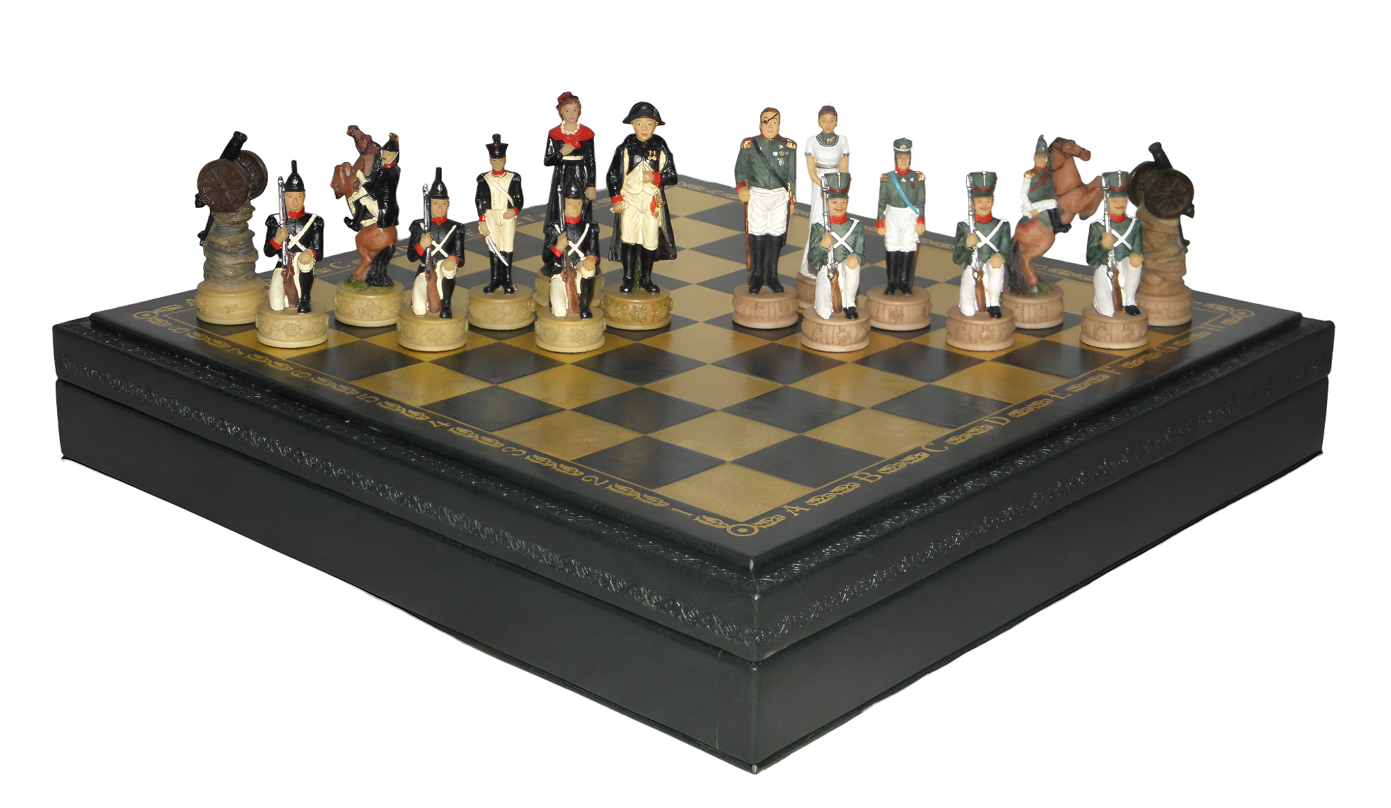Шахматы "Бородино" включает в себя фигуры, которые созданы по мотивам событий знаменитого Бородинского сражения – истинное воплощение самой истории, застывшей в шахматах, и доску размером 35x35 см, выполненную из высококачественного дерева и покрытую кожей.