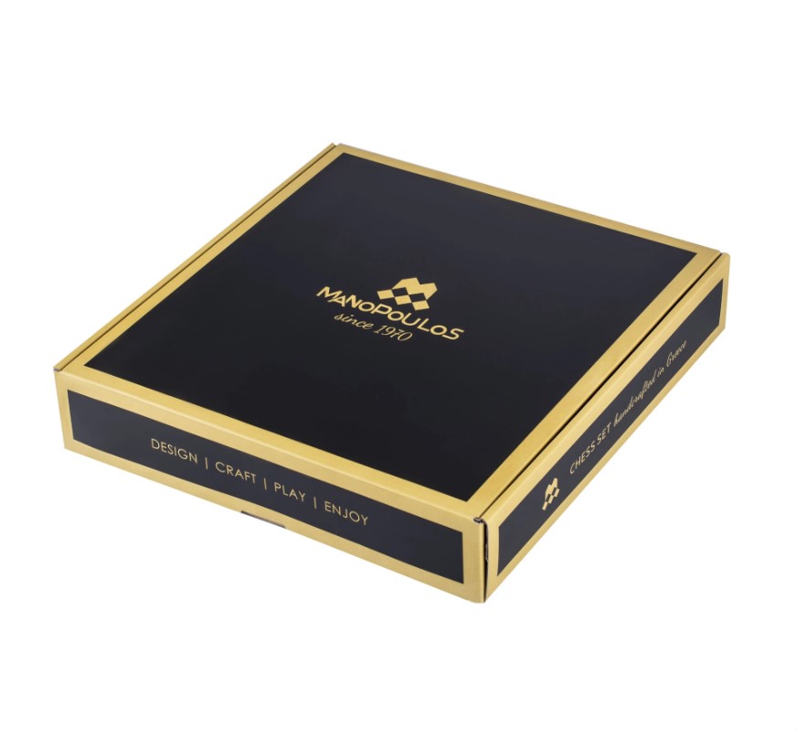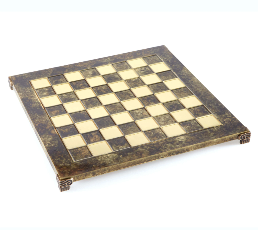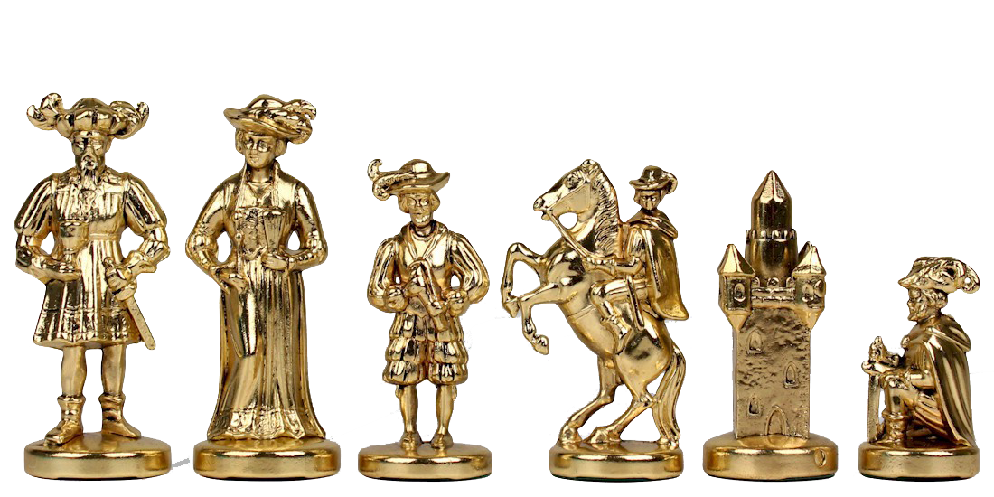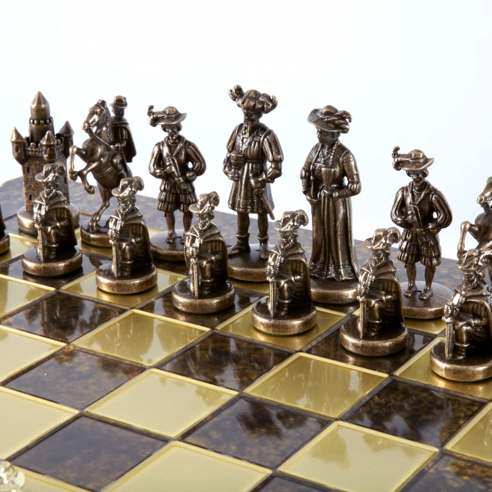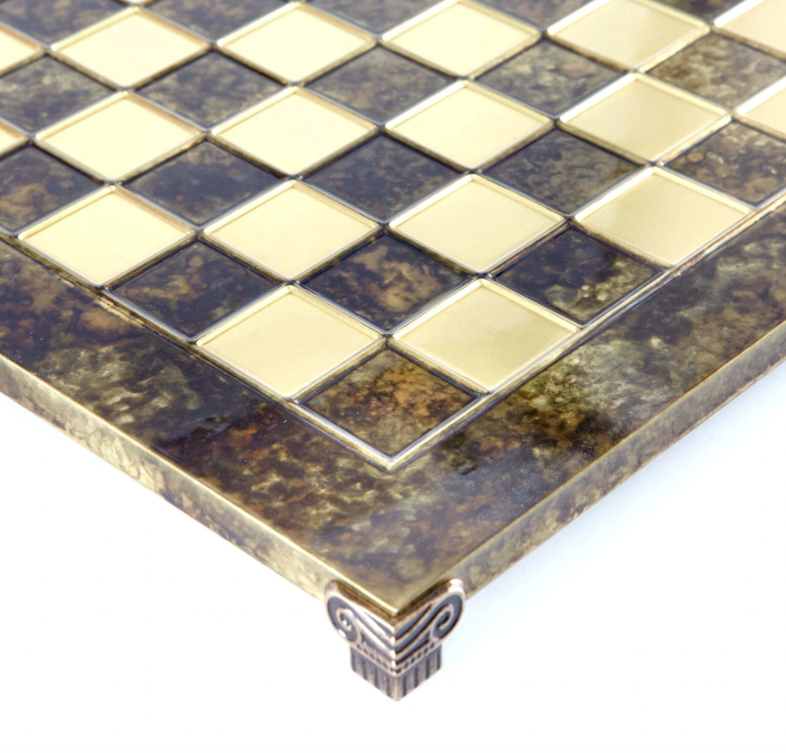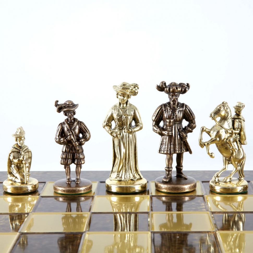 В этом наборе шахматная доска – коричневая; фигуры цвета золото и бронза.