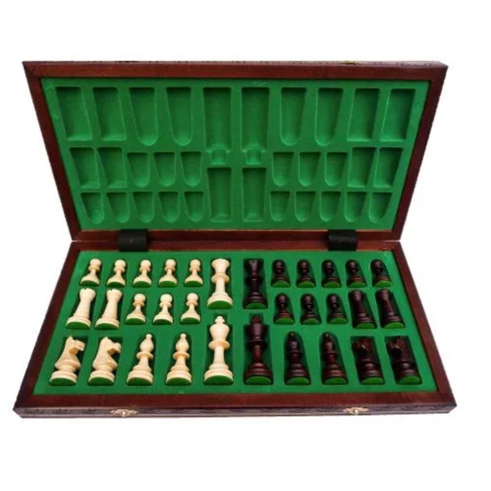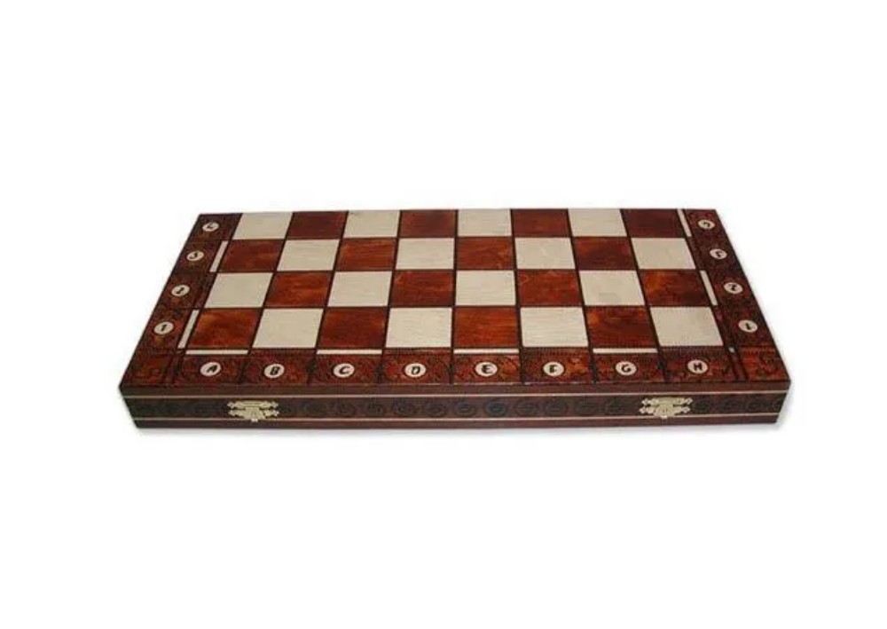 Внешняя сторона украшена резьбой, что придает шахматам собственную изюминку. Цифры и буквы видно хорошо, за счет контраста цветов. Крючки, с помощью которых предотвращается открытие, узорные. Внутри имеется мягкая подкладка с индивидуальной разметкой под каждую фигурку. Это позволяет аккуратно сложить всё внутрь и переносить, не опасаясь за сохранность внешнего вида фигурок.