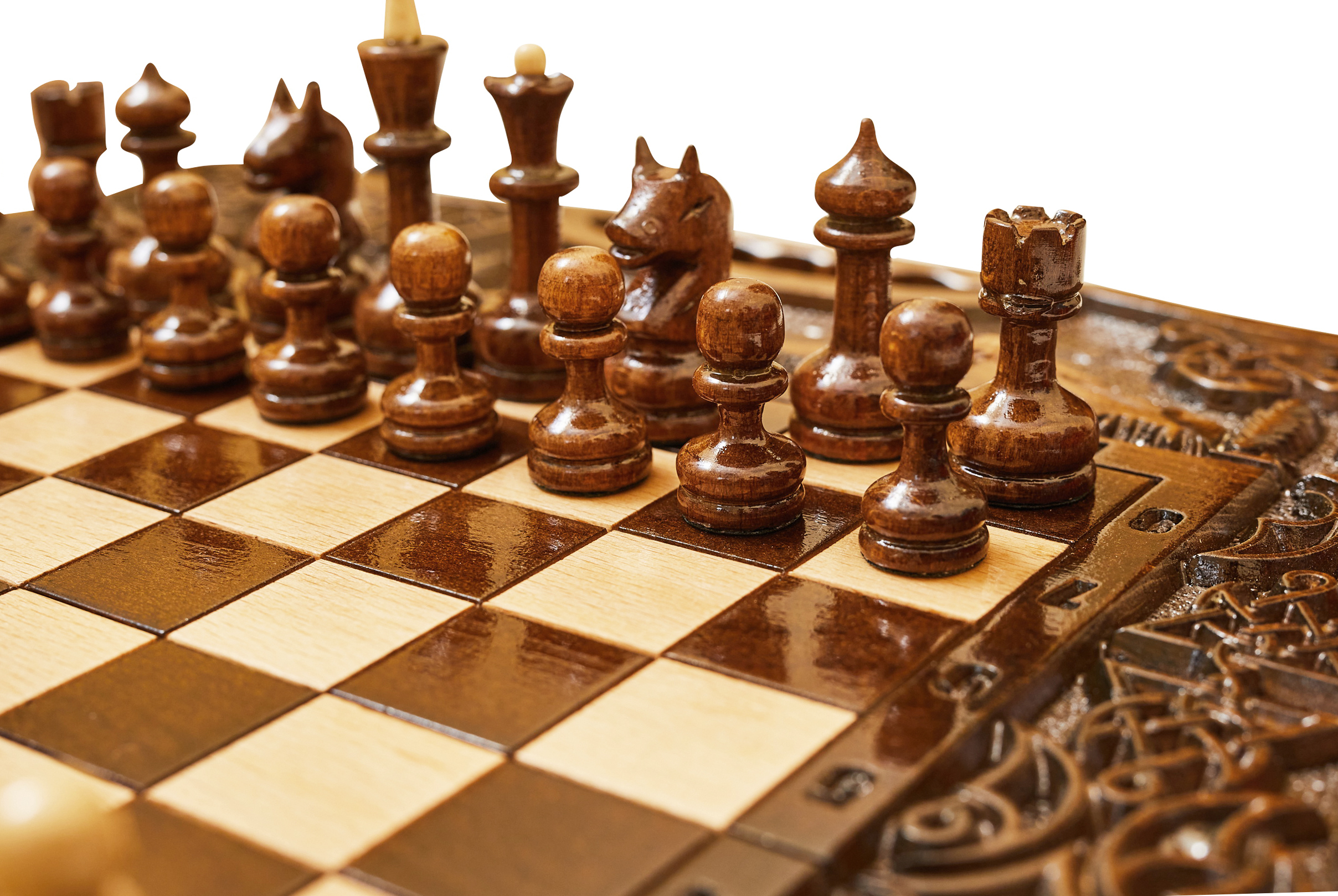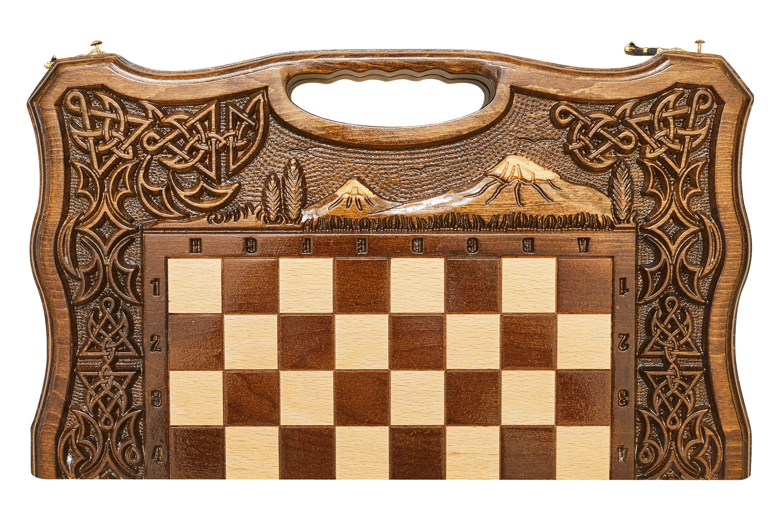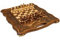 Верхняя часть резной доски украшена витиеватым оригинальным узором, который обрамляет собой шахматное поле. Внутри – поле для нард, которое тоже декорировано изящными узорами. Удобные ручки и надежный чехол позволяют надежно хранить набор и легко брать его с собой при необходимости.