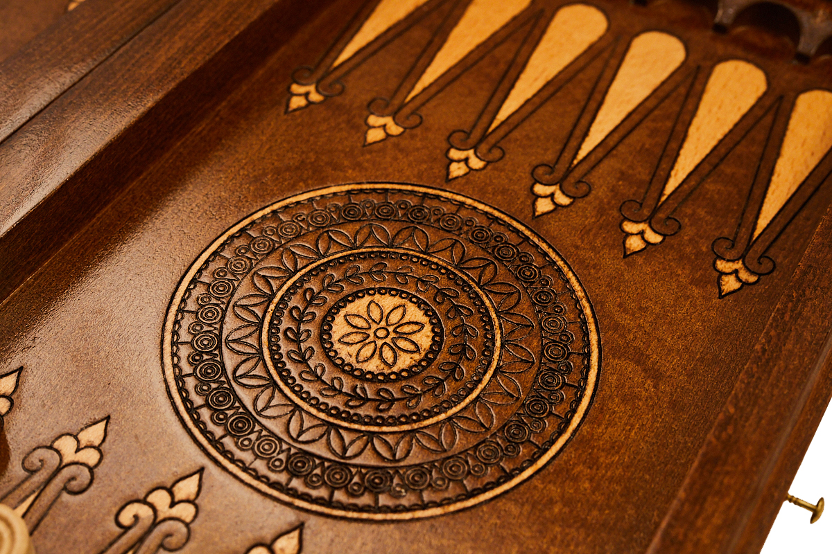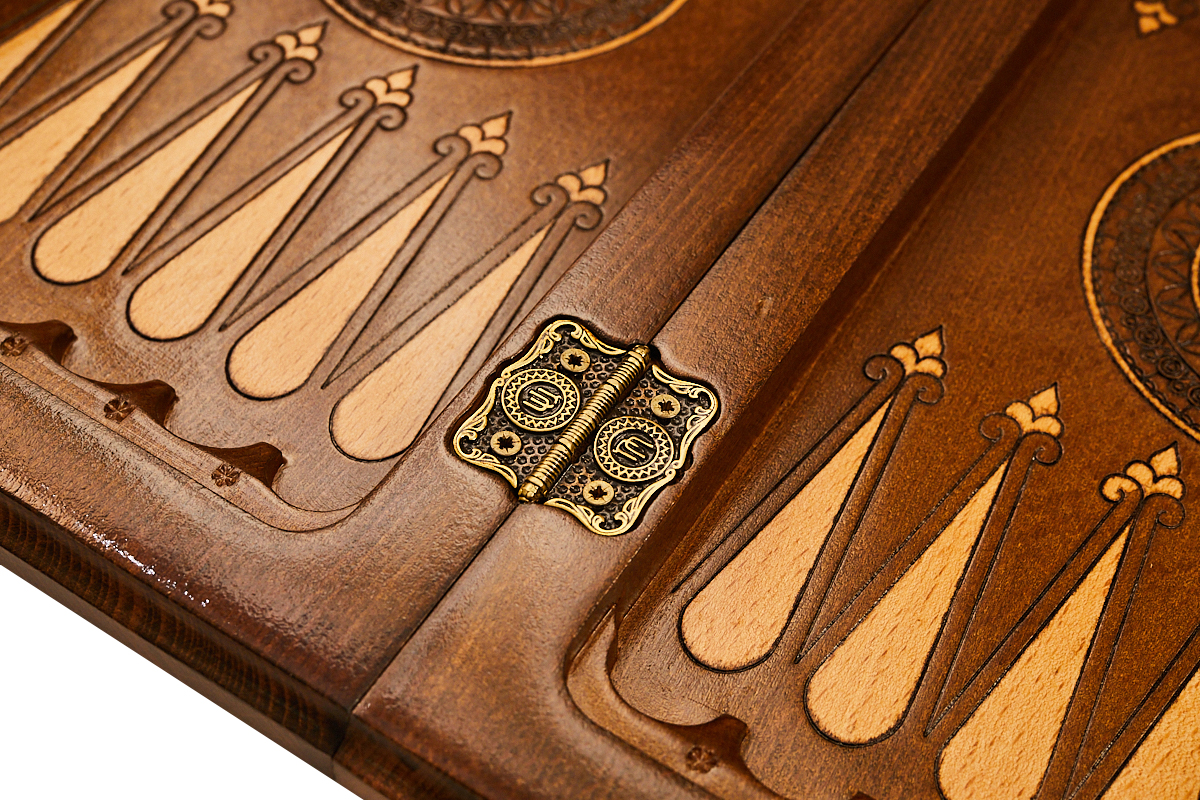 Снаружи нанесён геометрический узор, а древесная фактура намеренно оставлена, придавая доске уникальности и статусности. На внутренней части в центре нанесён красивый узор, а каждая лунка для фишек дополнительно подчёркнута каплевидным рисунком. Петли и крючки отлиты в специальных формах из меди.