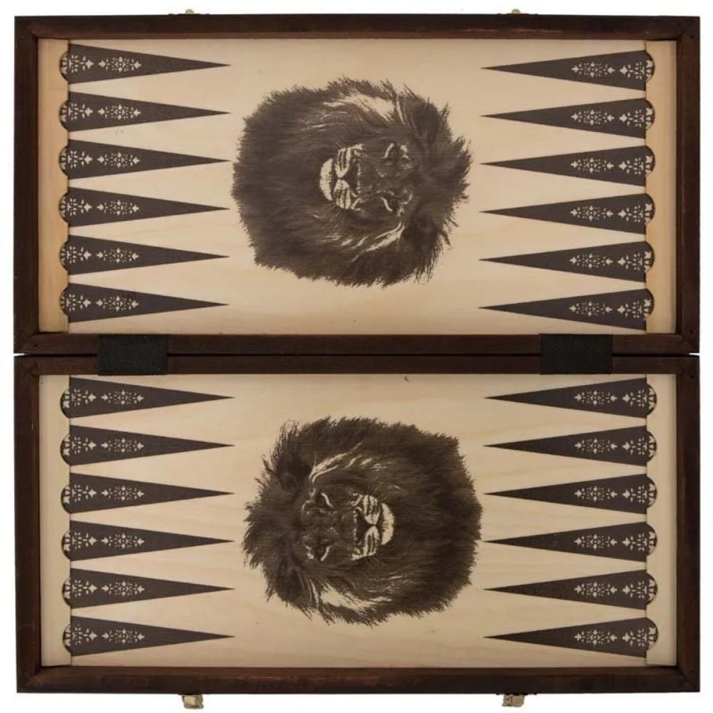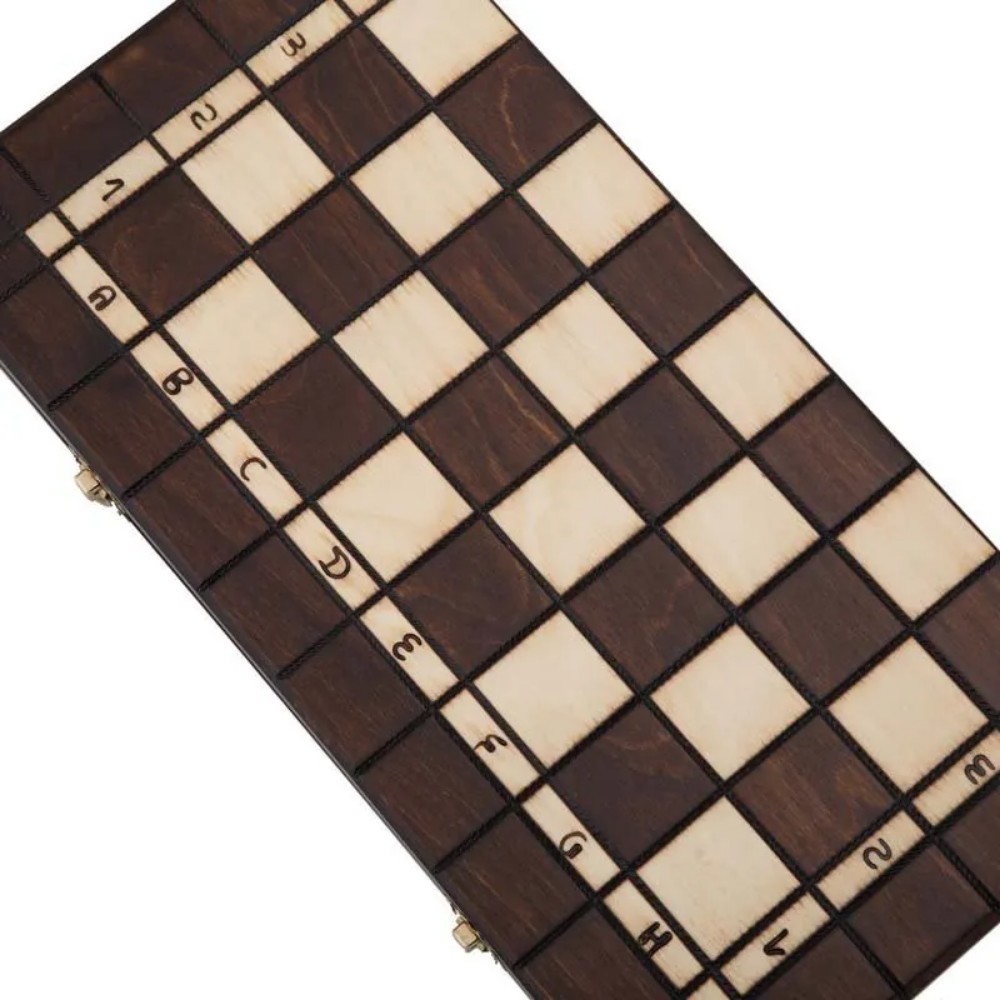 Верхняя часть доски традиционно размечена под игру в шашки или шахматы - это поле в клетку размером 8х8. Внутренняя сторона доски полностью посвящена нардам. Доска складывается напополам и надежно закрывается, а внутри можно хранить все мелкие детали, необходимые для игр - так ни одна фигура, ни одна фишка точно не потеряется.