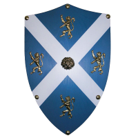 Деревянный геральдический щит "Уильяма Уоллеса, Шотландия". Окрашен в бело-голубой цвет (цвета флага Шотландии). Щит украшен четырьма восстающими львами и головой льва в центре креста. По контуру щит украшен крупными заклепками. Декаративные эллементы выполнены из латуни.