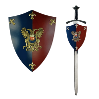 Деревянный геральдический мини-щит Толедо "Двуглавый Орел". Щит изготовлен из дерева, окрашен вручную в традиционные геральдические цвета и имеет роскошные накладки из замака под золото в виде лилий флёр-де-лис и двухглавого орла. На обратной стороне имеется цепь для подвешивания на стену и скоба для крепления меча к щиту (вариант композиции изображен на фото)