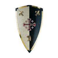 Металлический щит Ордена Святого Гроба Господнего Иерусалимского с крестом в центре, эмблемой крестоносцев - Тамплиеров. По верхним углам щита расположены эмблемы Флер-де-Лис, представляющих чистоту и свет. А в нижней части щита красуется голова орла