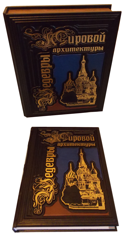 Цельнокожаный переплёт ручной работы, украшен иллюстрированной вставкой из цветного металла и из куска кожи другого цвета..