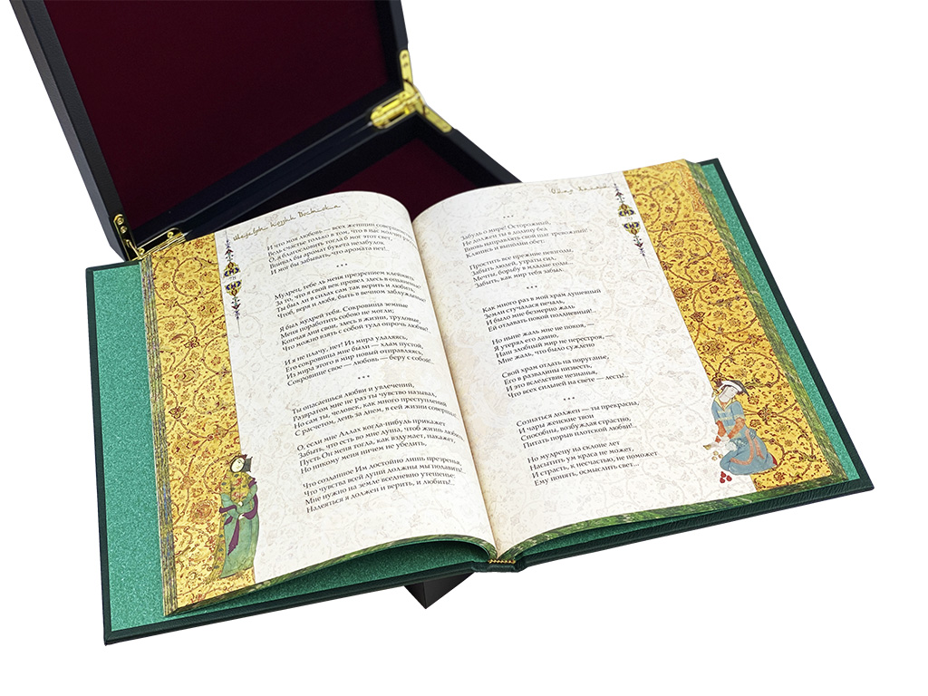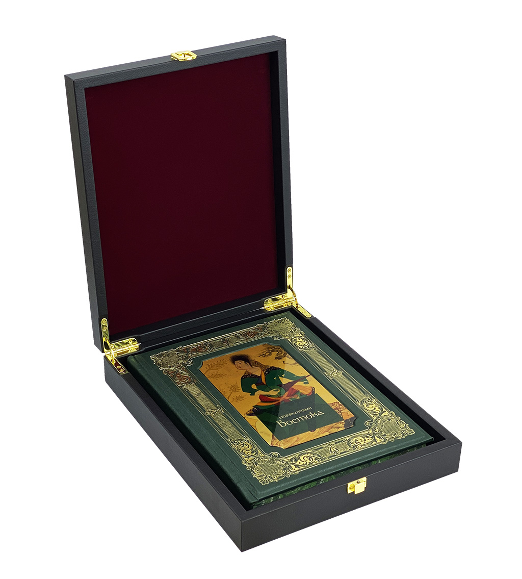 Дизайн прекрасно сочетает в себе золотое и блинтовое тиснение, художественную металлическую вставку, соответствующую тематике издания, а также крашенный в тон переплетного материала обрез.